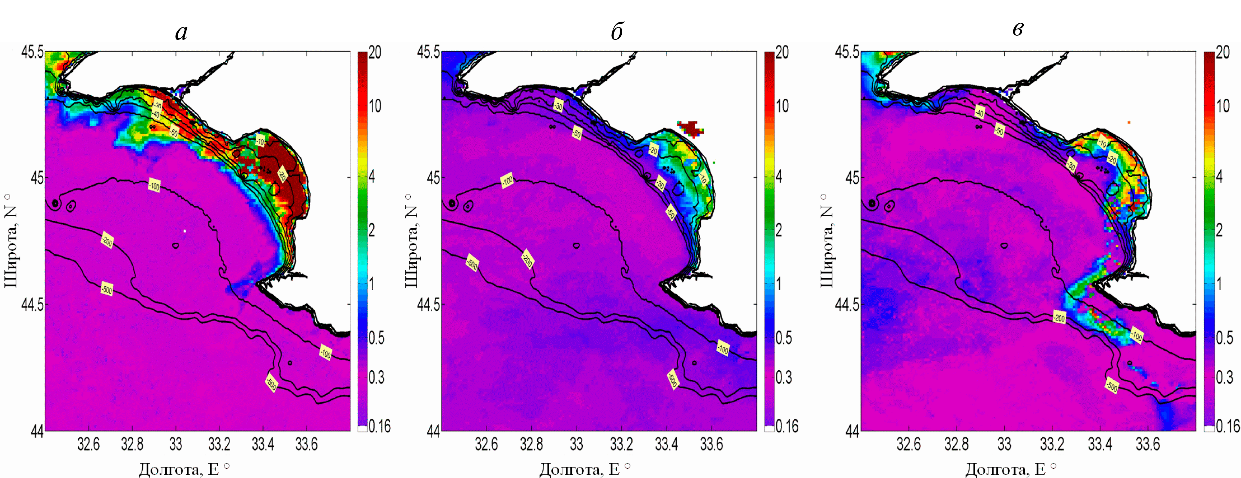 Рис. 2. Средние значения концентрации ВВ у побережья Западного Крыма (2003 – 2015 гг.) по данным MODIS/Aqua в период действия штормовых а — южных ветров; б — восточных ветров; в — западных ветров.