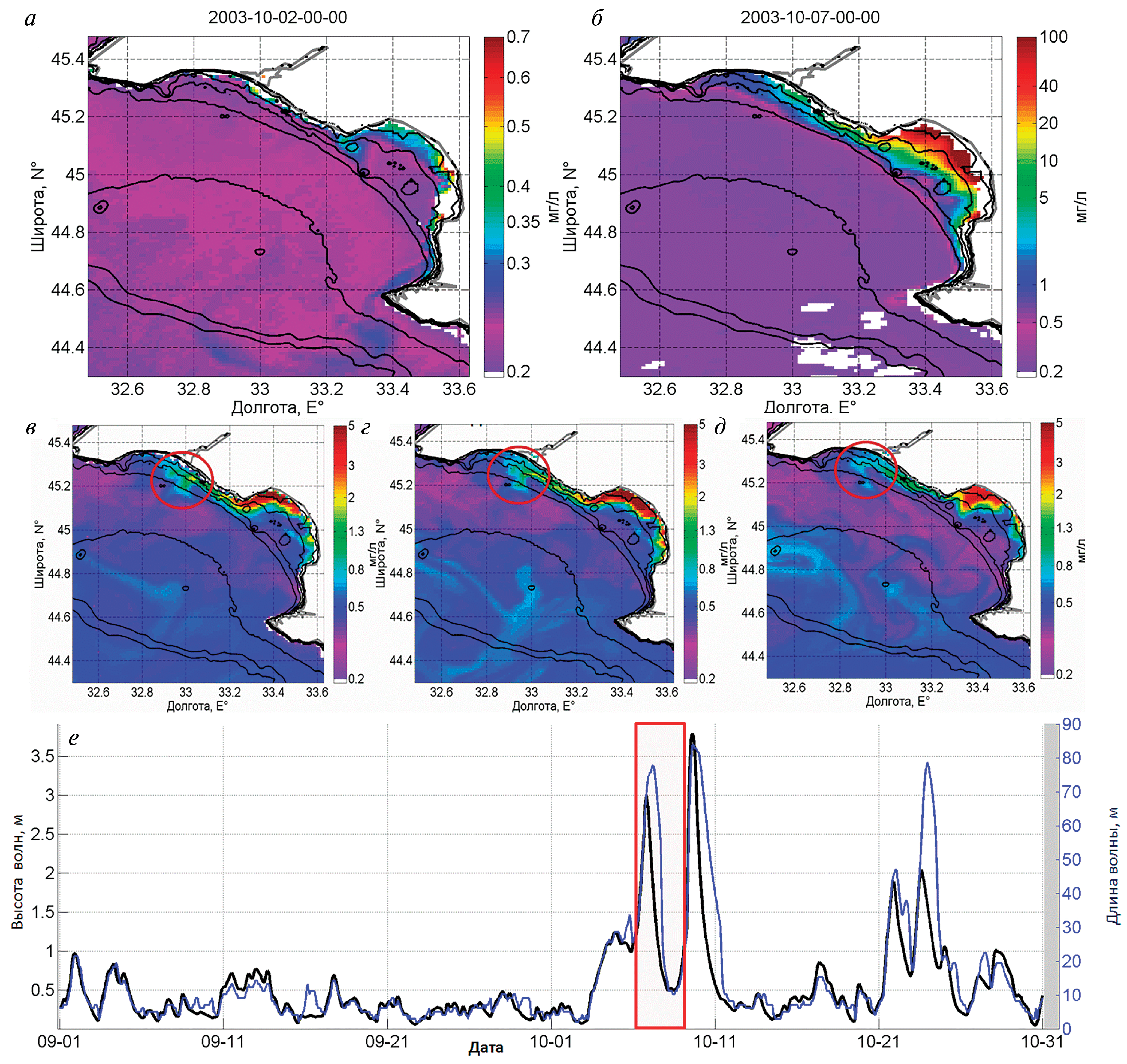 Рис. 3. Величины концентрации ВВ по данным MODIS-Aqua за a — 2 октября 2003 г.; б — 7 октября 2003 г.; в — 3 апреля 2009 г.; г — 4 апреля 2009 г.; д — 6 апреля 2009 г.; е — график длины и высоты волн, рассчитанные по модели SWAN. Черными линиями нанесены изобаты.