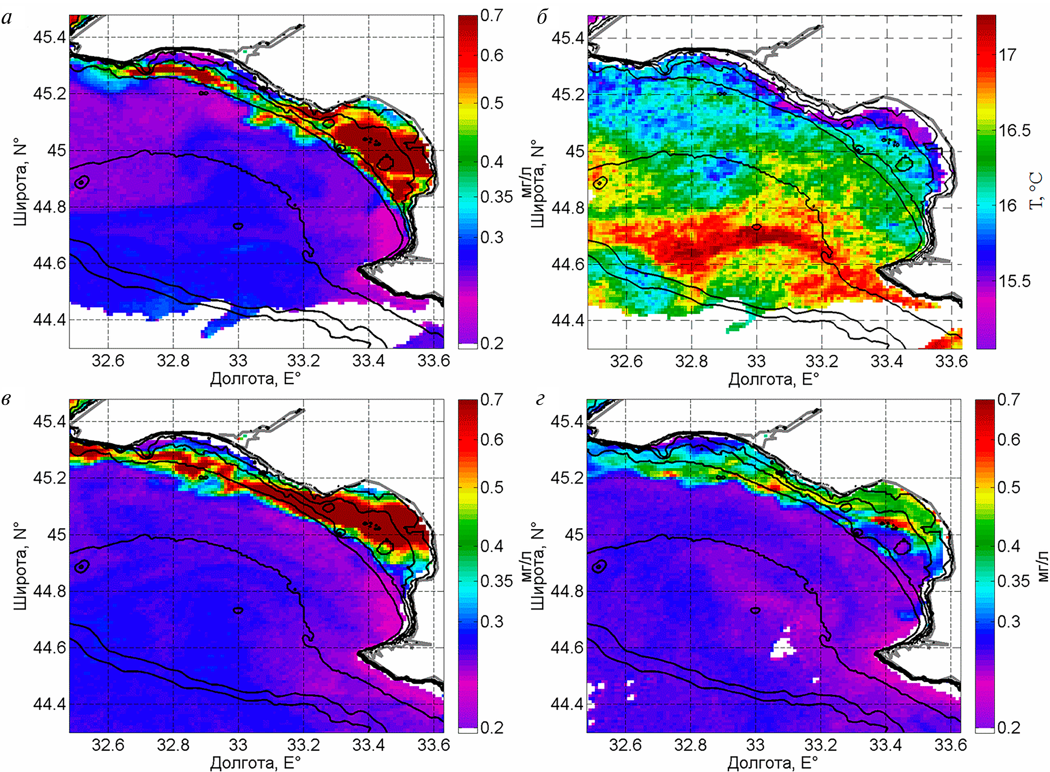 В работе использовались данные сканеров MODIS/Aqua за период 2003–2016 гг. с пространственным разрешением 1 км и временным разрешением 1 сутки (Level‑2). Данные получены в отделе дистанционных методов исследования Морского гидрофизического института (http://dvs.net.ru) и из архива http://oceandata.sci.gsfc.nasa.gov/. Для определения концентрации ВВ применялся региональный алгоритм, основанный на комбинации спектральной яркости на различных длинах волн по данным MODIS (Кременчуцкий и др., 2014). Используемый алгоритм был калиброван на основе измерений, которые проводились как в водах открытого моря, так и в прибрежных водах с большими концентрациями взвеси (Завьялов и др., 2014).