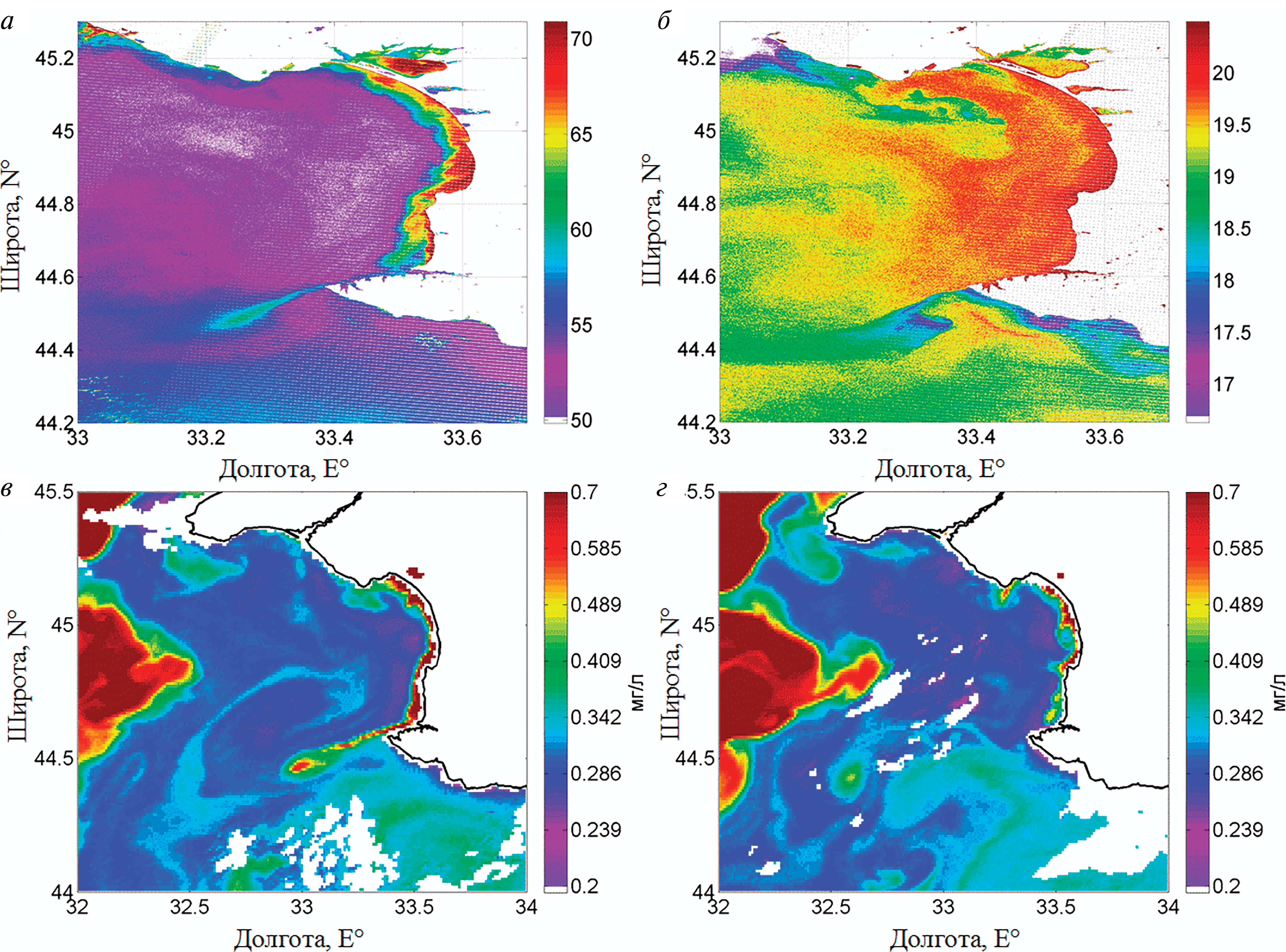 Рис. 5. а, в, г — концентрация ВВ по данным MODIS/Aqua за 8, 9 и 11 ноября 2008 г. соответственно; б — температура поверхности моря по данным MODIS/Aqua за 8 ноября 2008 г.