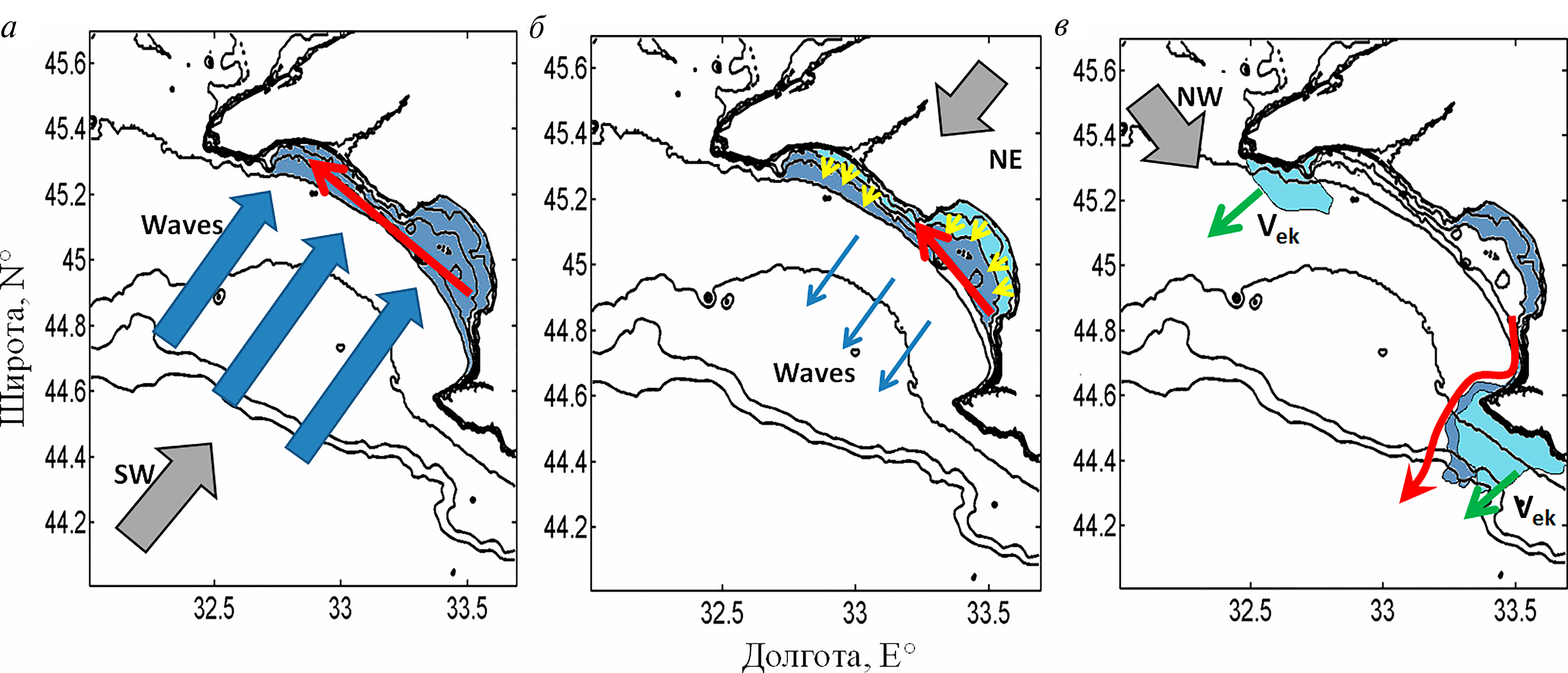 Рис. 8. Схемы образования и распространения ВВ: а — при юго-западном ветре; б — при северо-восточном ветре; в — при северо-западном ветре (обозначения: серая стрелка – направление ветра, синяя – направление волны, красная – направление течения, зеленая – направление экмановской скорости; голубая область — зона ветрового сгона, апвеллинга, синяя область – взмученные воды).