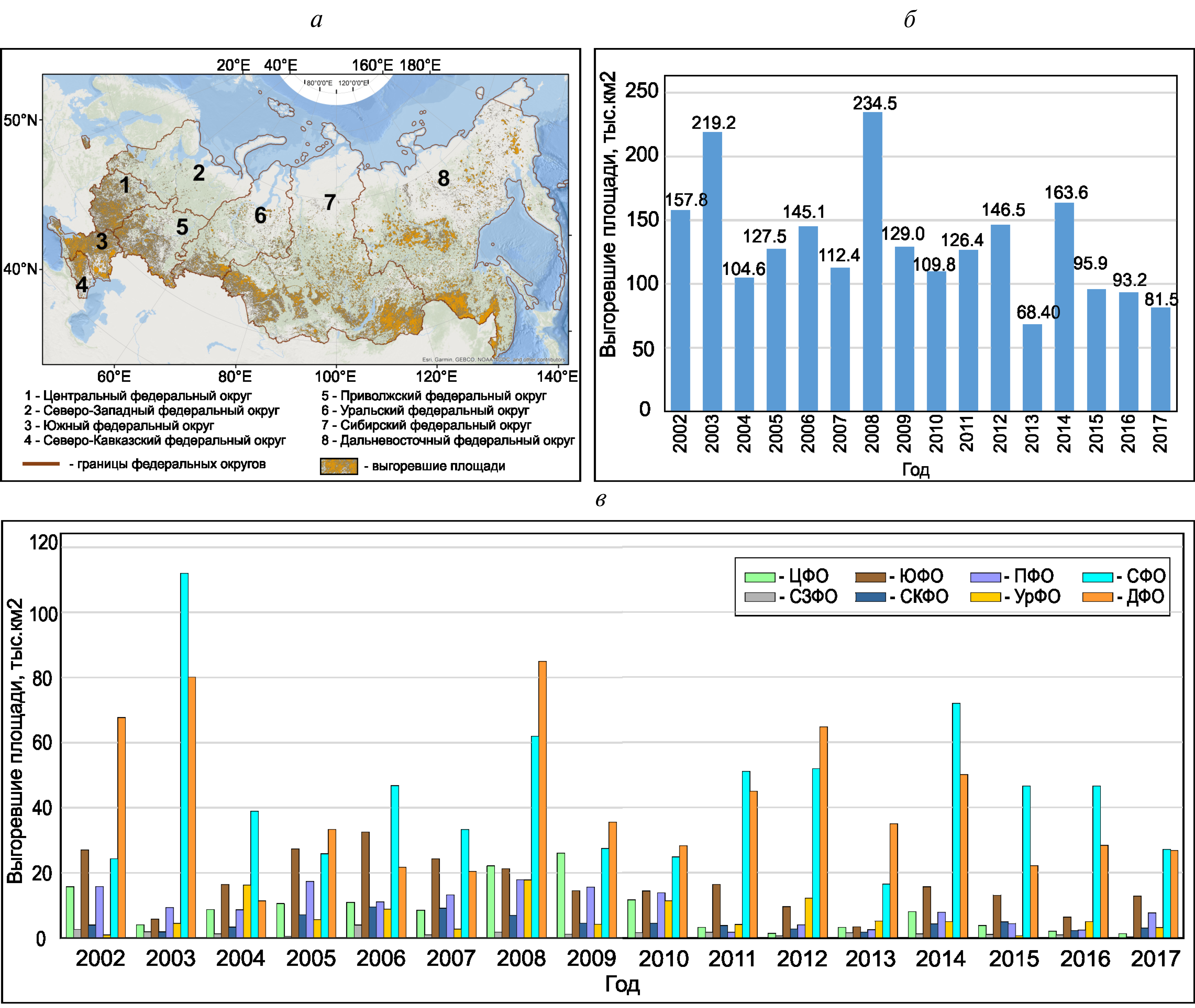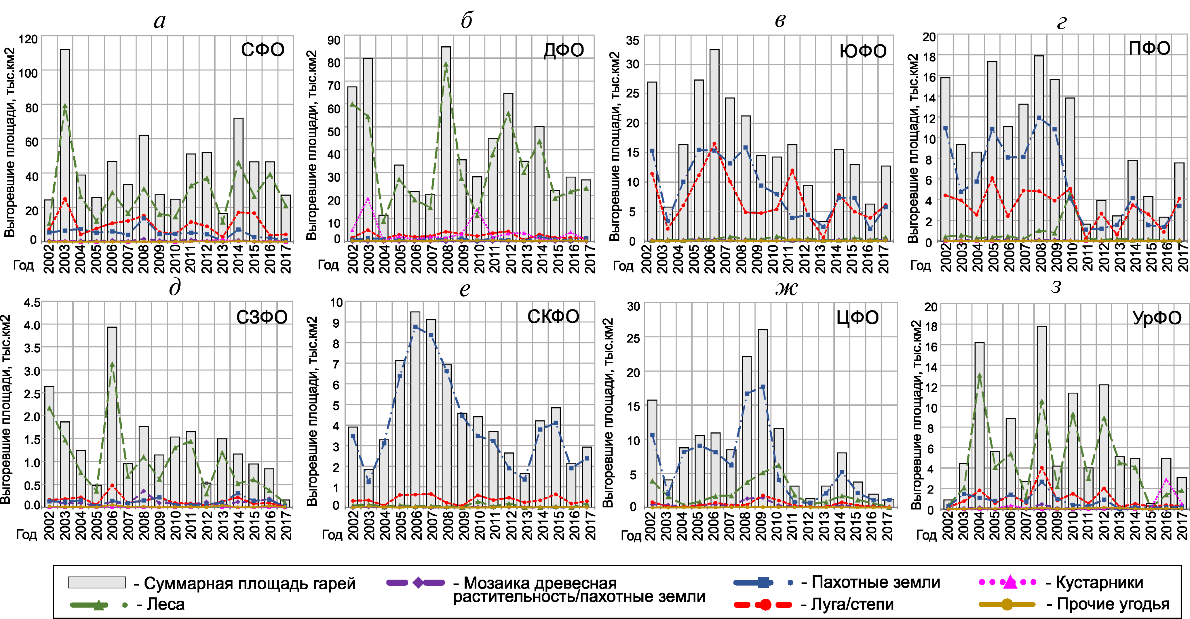 В исследуемый период времени суммарные значения выгоревших за год площадей для каждого из 8-ми федеральных округов (ФО) составили: для Центрального федерального округа (ЦФО) от 4.02 тыс. км2 (в 2003 г.) до 26.03 тыс. км2 (в 2009 г.), для Северо-Западного федерального округа (СЗФО) от 0.16 тыс. км2 (2017 г.) до 3.93 тыс. км2 (2006 г.), для Южного федерального округа (ЮФО) от 3.30 тыс. км2 (2013 г.) до 32.5 тыс. км2 (2006 г.), для Северо-Кавказского федерального округа (СКФО) от 1.65 тыс. км2 (2013 г.) до 9.49 тыс. км2 (2006 г.), для Приволжского федерального округа (ПФО) от 1.62 тыс. км2 (2011 г.) до 17.88 тыс. км2 (2008 г.), для Уральского федерального округа (УрФО) от 0.89 тыс. км2 (2002 г.) до 17.78 тыс. км2 (2008 г.), для Сибирского федерального округа (СФО) от 16.40 тыс. км2 (2013 г.) до 111.94 тыс. км2 (2003 г.), Дальневосточный федеральный округ (ДФО) от 11.37 тыс. км2 (2004 г.) до 84.87 тыс. км2 (2008 г.).