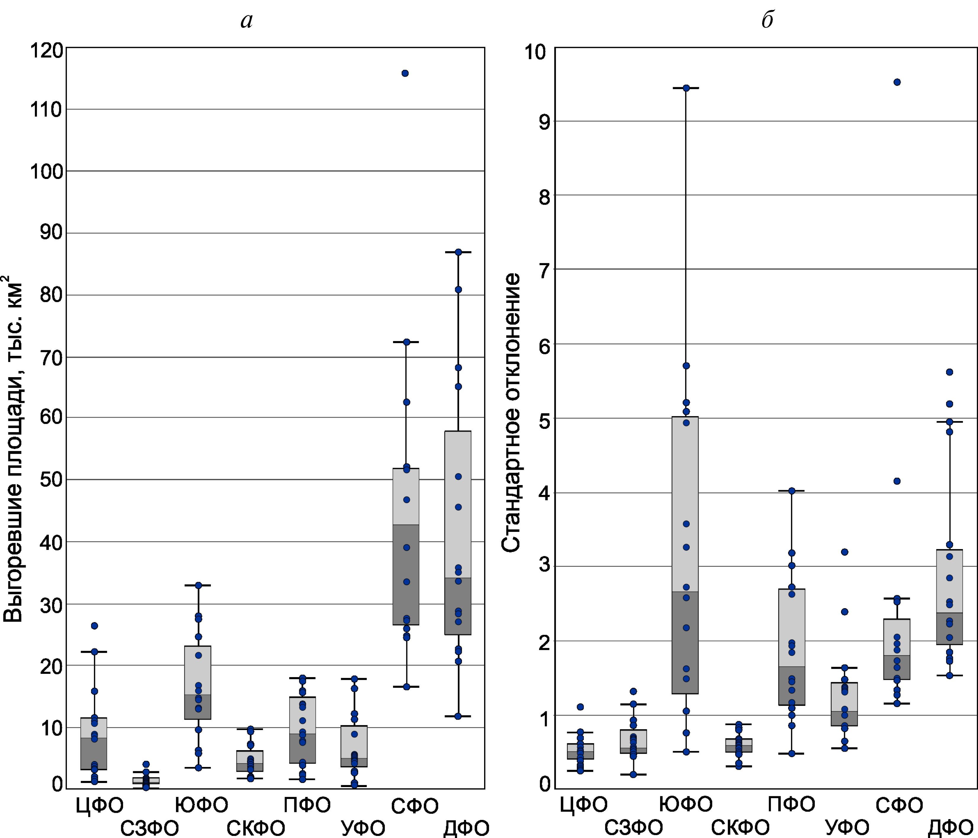 Рис. 2. Распределение размеров суммарных площадей (а), выгораемых ежегодно в различных ФО России, и стандартные отклонения (б), рассчитанные для периода с 2002–2017 гг.