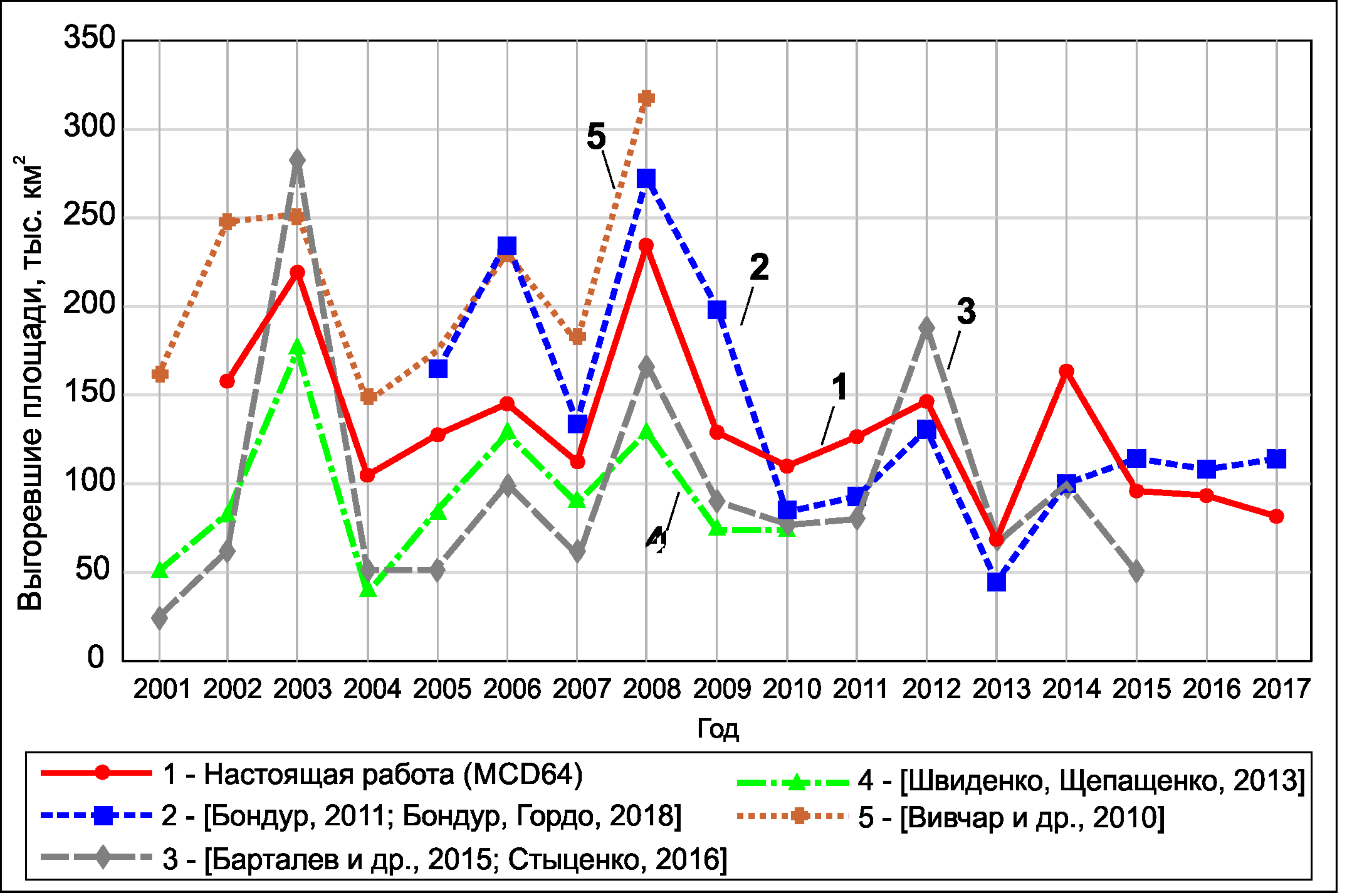 На рис. 3 приведены результаты оценок площадей, выгоревших от природных пожаров на всей территории России, полученные по данным дистанционного зондирования в различных исследованиях (Бондур, 2011, Бондур, Гордо, 2018, Bondur, Gordo, 2017, Барталев и др., 2015, Стыценко, 2016, Вивчар и др., 2010, Швиденко, Щепащенко, 2013).