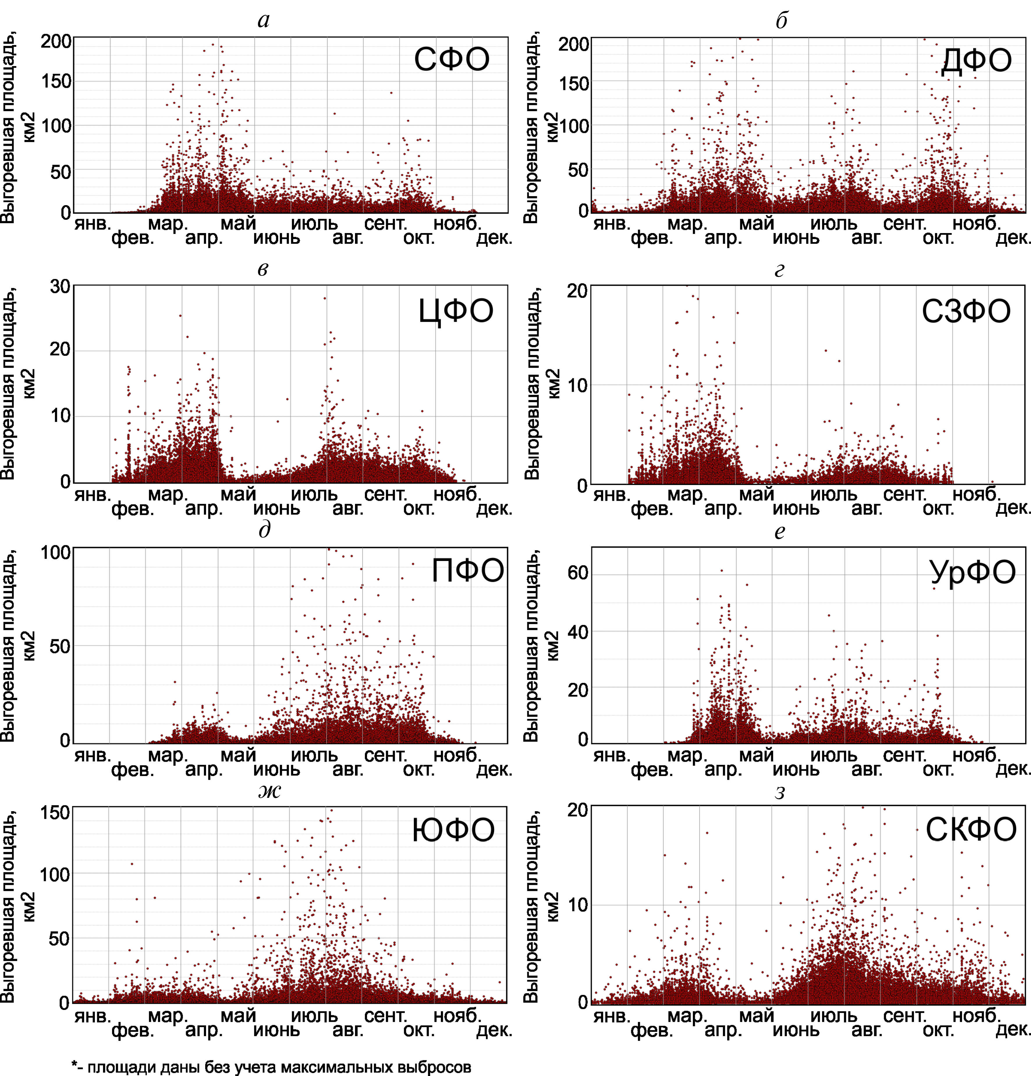 Максимальные площади выгорают: в СФО в период с марта по май (см. рис. 4а); в ДФО с марта по май, в июле и в октябре (см. рис. 4б); в ЮФО с июня по август (см. рис. 4ж); в ПФО с июля по октябрь (см. рис. 4д); в СЗФО в марте, апреле и июле (см. рис. 4г); в СКФО в марте, апреле, с июля по сентябрь и в ноябре (см. рис. 4з); в ЦФО в апреле и июле–августе (см. рис. 4в); в УрФО в апреле, мае, июле, августе и октябре (см. рис. 4е). Анализ рис. 4 показал, что порядка 1% выгоревших за год площадей приходится на период с ноября по март, большая часть из них связана с палами сельхозугодий в ДФО и ЮФО, также выгоревшие территории обнаруживаются по данным MСD64 в ЦФО (Брянская и Смоленская области), в СЗФО (Калининградская область) и СКФО.