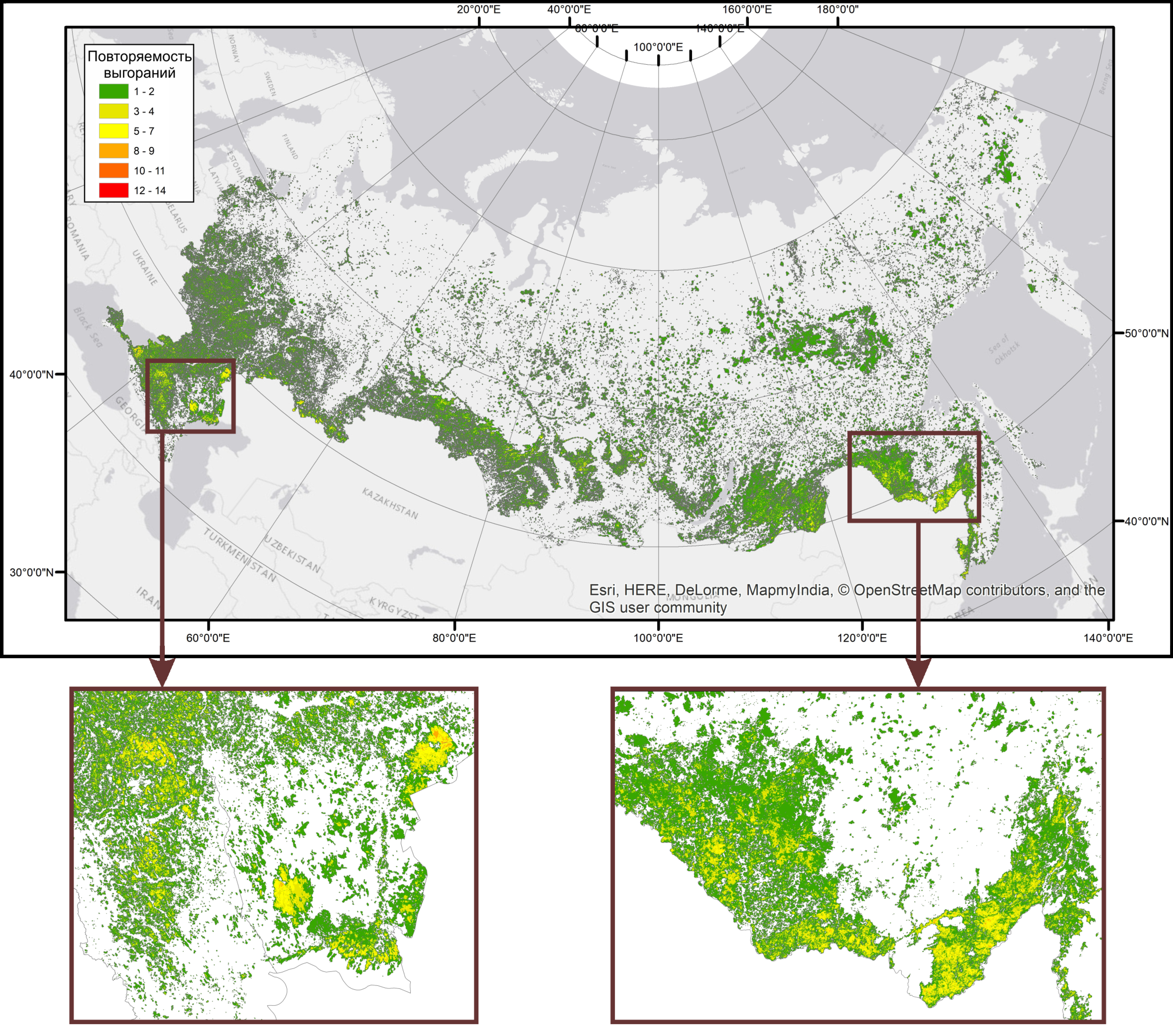 Анализ частоты горимости площадей на территории России показал, что за 16-летний период порядка 20% преимущественно лесных территорий выгорало повторно.