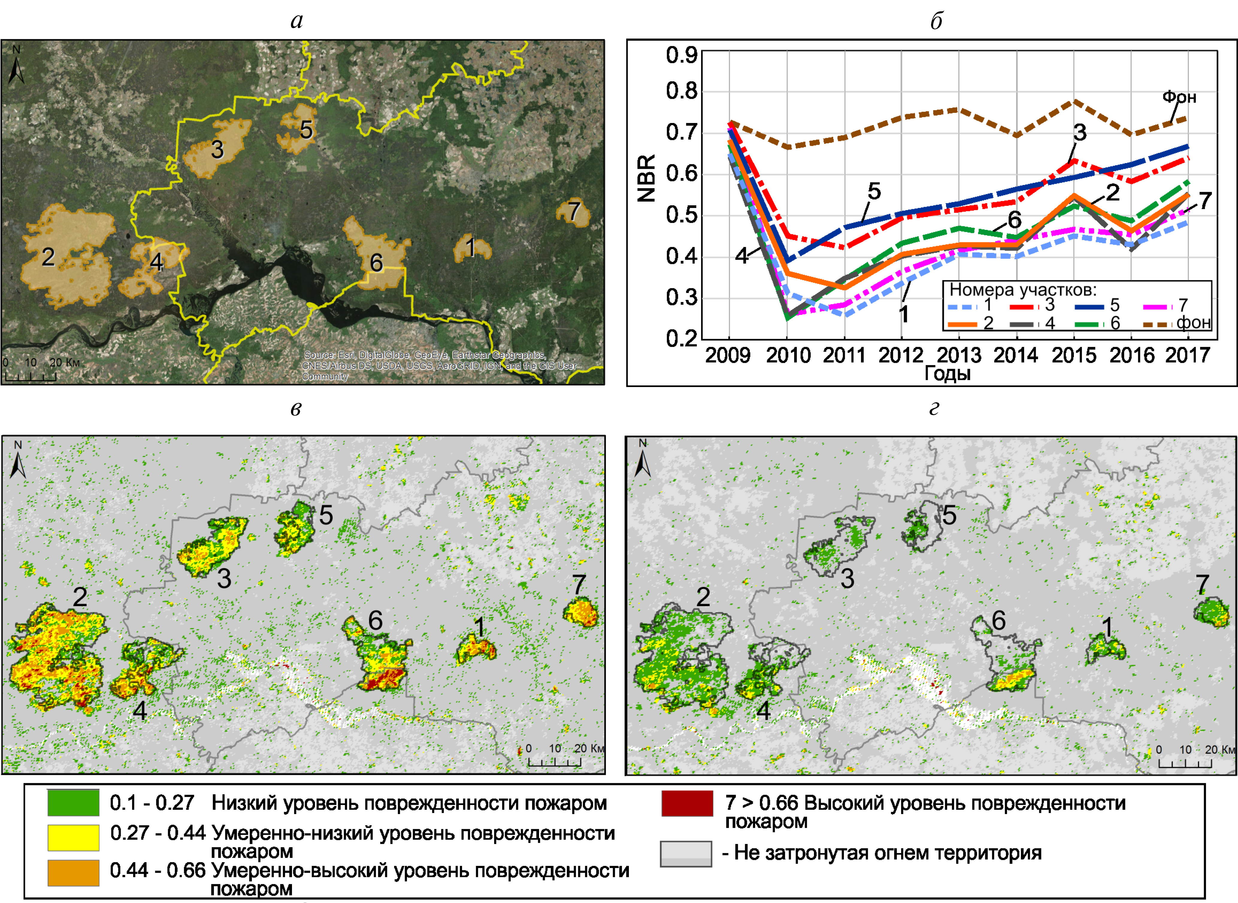 Для оценки точности определения площадей, полученных по данным MODIS, был выбран подход, при котором выгоревшие территории классифицировались и объединялись в ареалы гарей в зависимости от степени повреждения растительного покрова. Хорошие результаты по выделению участков с различной степенью повреждения растительного покрова дает использование спектральных индексов, получаемых по данным космического мониторинга, в том числе таких как NDVI (нормализованный вегетационный индекс) и NBR (нормализованный индекс гари) и их модификаций (dNDVI, dNBR и др.) (Бондур, 2010, Бондур, Воробьев, 2015, Бондур, Чимитдоржиев, 2008а, б, Аэрокосмический…, 2012, Бондур и др., 2016, 2019, Воробьев и др., 2014, Ryu et al., 2018, Jin et al., 2012).