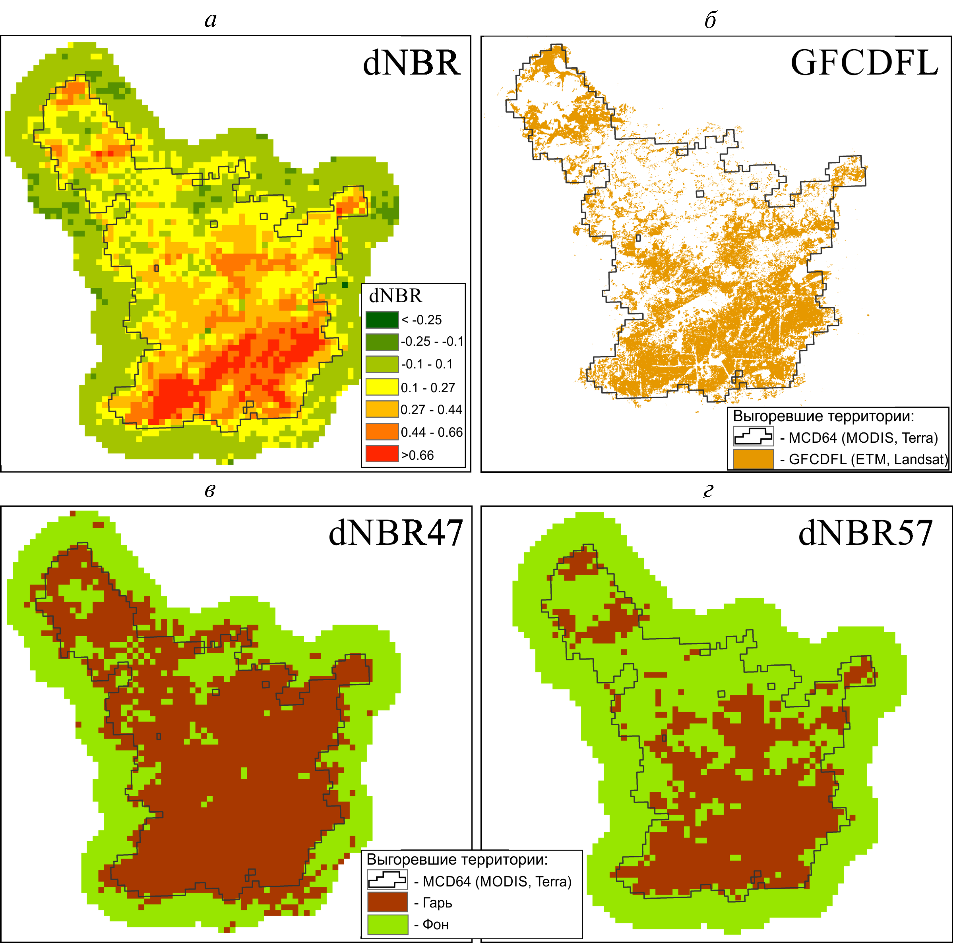Разностной индекс гарей dNBR вычислялся на основании разности индексов NBR, полученных в пред- и постпожарный периоды по двум разновременным изображениям. Полученные значения dNBR для каждого участка были переклассифицированны в двух вариантах: 1) 1-й класс — фон, 2-й класс — гари, со степенью повреждения пожаром от низкого до высокого уровня (dNBR47); 2) 1-й класс — фон, 2-й класс — гари, со степенью повреждения пожаром от умеренно-низкого до высокого уровня (dNBR57).