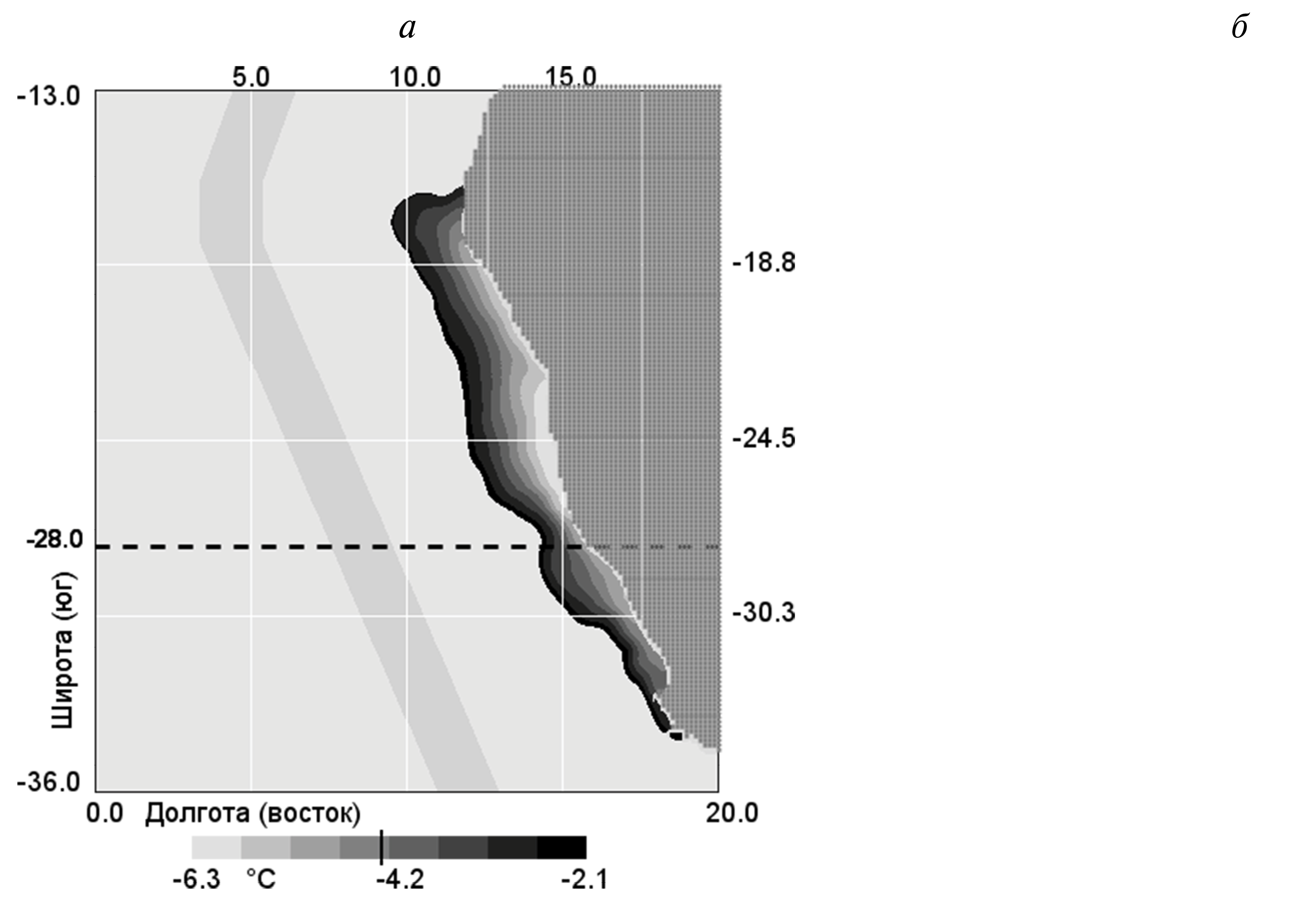 Оффшорная зона выбиралась следующим образом. На любом разрезе, нормальном к береговой черте, зона с повышенными горизонтальными градиентами ТПО достаточно четко выделяется. Она может служить основой для определения границ апвеллинговой зоны. Для дальнейших расчетов ТИА оффшорную зону будем выбирать с учетом конфигурации береговой черты и горизонтального градиента ТПО, а именно: западнее максимума градиента на зональном разрезе ТПО на 1° долготы. Ширину оффшорной зоны будем считать равной 2°. Таким образом, мы отказываемся от прямоугольной оффшорной зоны, при использовании которой не учитывается конфигурация берега, и от выбора оффшорной зоны на произвольном расстоянии от берега (от 400 до 1500 км), как было предложено в некоторых работах (например, Santos et al., 2005). На рис. 1 оффшорная зона показана ломаной полосой серого цвета.