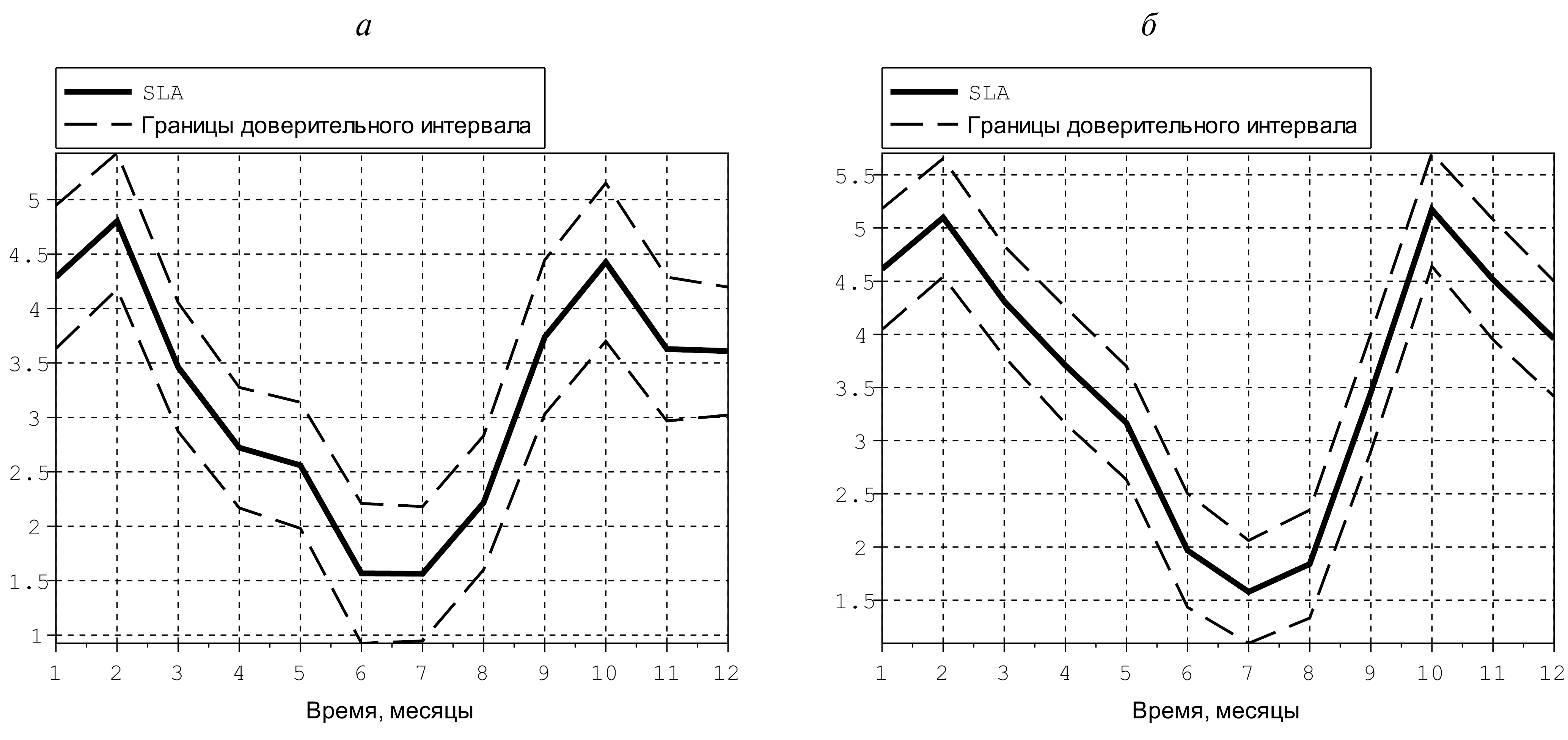 Рис. 4. Доверительные интервалы для климатического сезонного хода аномалии уровня моря (см), рассчитанные для южной (а) и северной (б) систем Бенгельского апвеллинга.