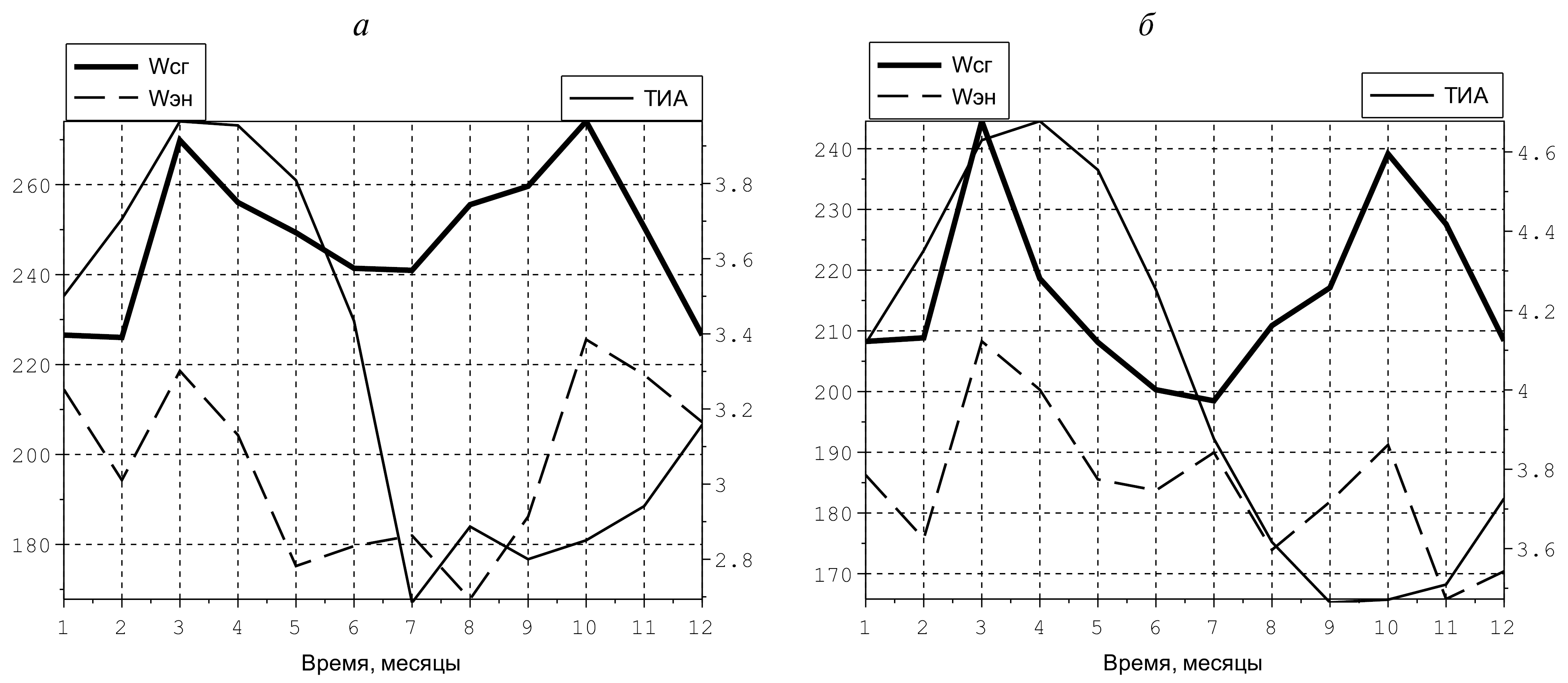 Рис. 5. Среднемесячные климатические значения скорости экмановского сгона (Wсг × 10–7, м/с, жирная линия), скорости экмановской накачки (Wэн × 7 × 10–7, м/с, штриховая линия) и термического индекса апвеллинга (ТИА × (–1), °C, тонкая линия) за период 1988–2017 гг., рассчитанные внутри ежемесячных климатических масок для северной системы Бенгельского апвеллинга (28°–13° ю. ш.). Расчеты проводились при TLconst = 2.0 °C (а) и TLconst = 3.0 °C (б).