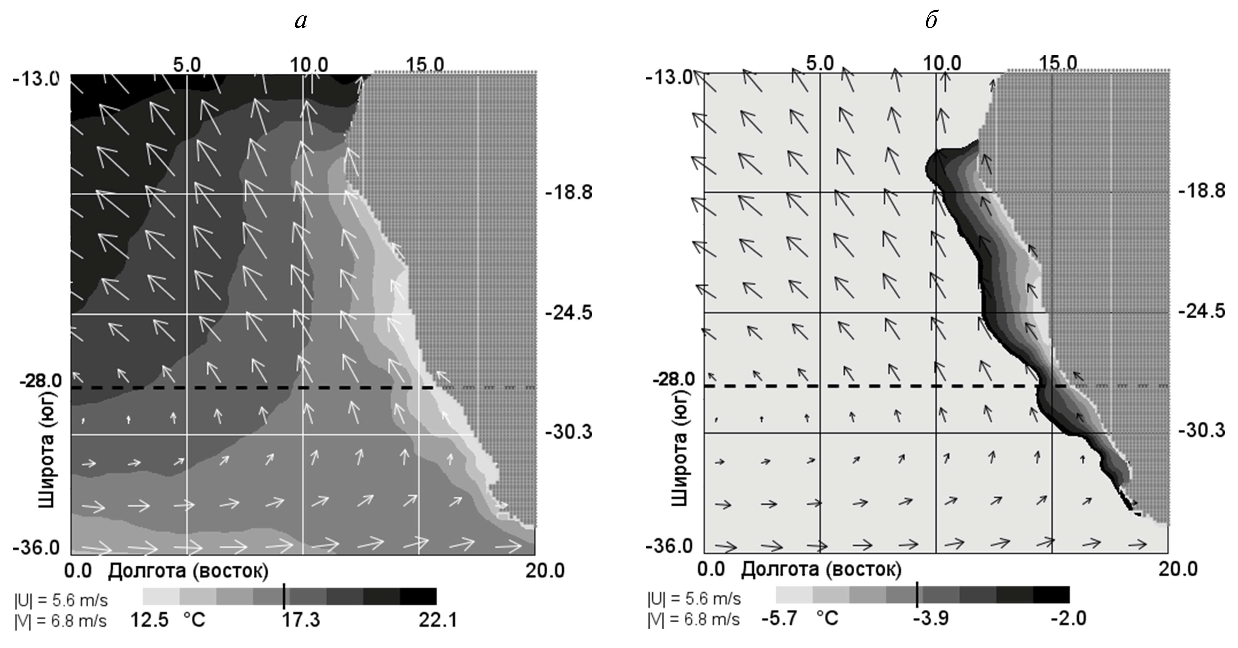 Геострофические течения на поверхности океана рассчитывались по градиентам аномалий уровенной поверхности за каждый месяц и помесячно усреднялись за весь период наблюдений. Расчеты всех пространственно-осредненных величин производились отдельно для областей БА к северу и к югу от 28° ю. ш.