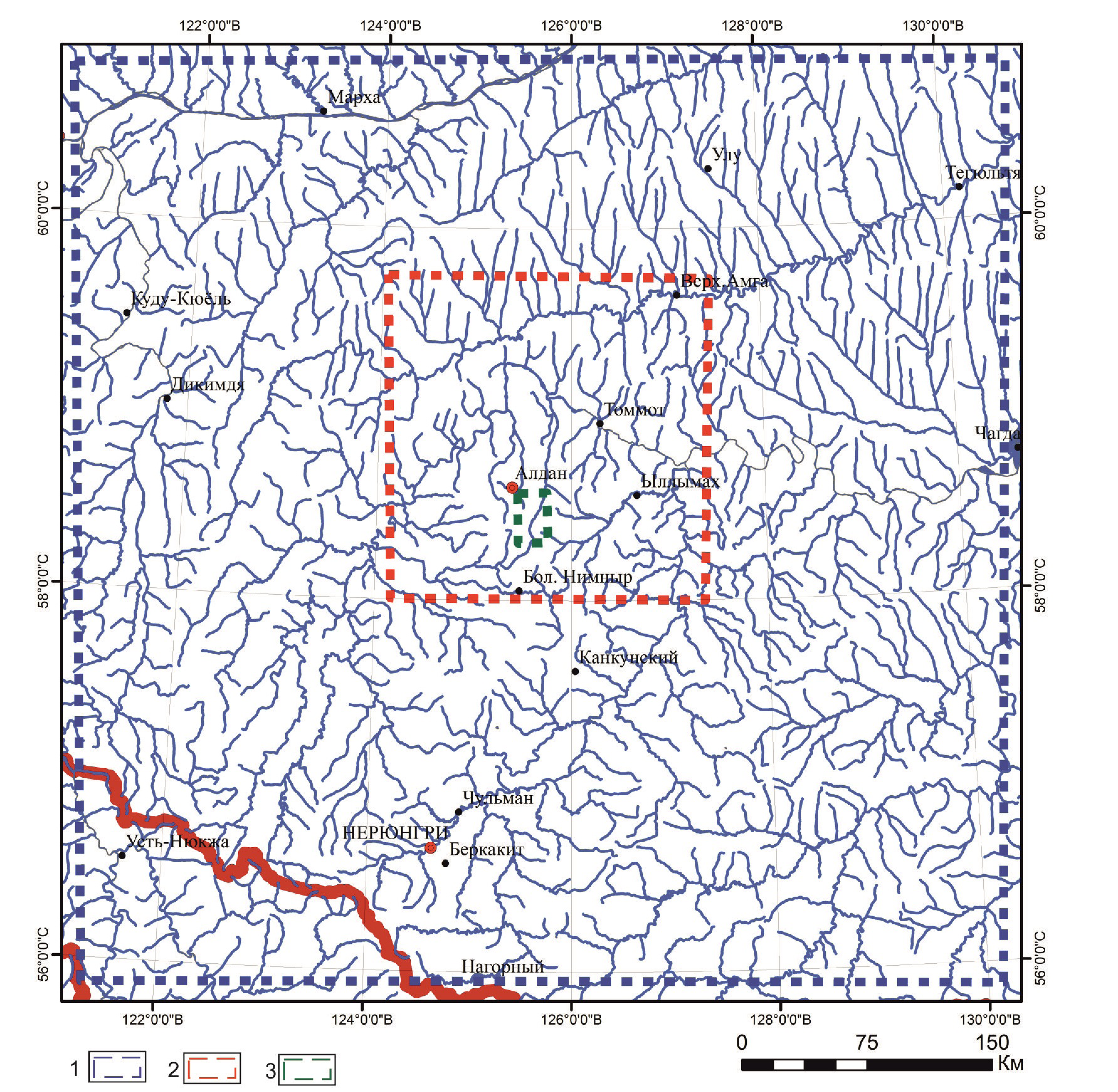 Рис. 1. Контуры работ по этапам, показанные на гидрографической схеме Южной Якутии. 1 — первый этап; 2 — второй этап; 3 — третий этап.