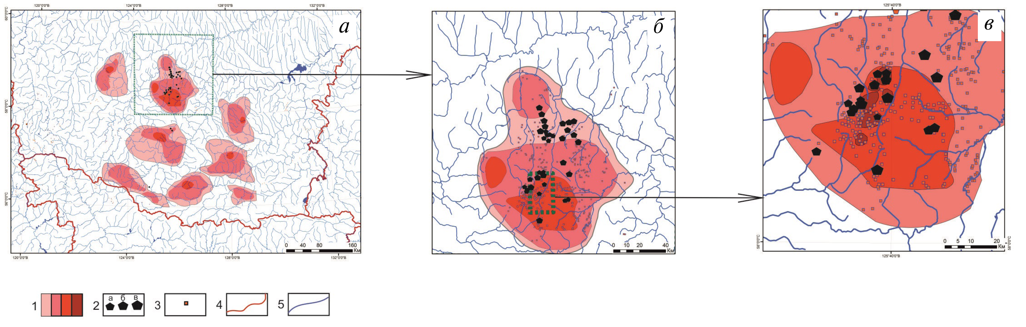 Рис. 2. Схема перспективных участков Южной Якутии по результатам анализа дистанционных, геофизических, геологических и др. материалов различного разрешения для локализации золотого оруденения в рангах: а — район; б — узел; в — поле.