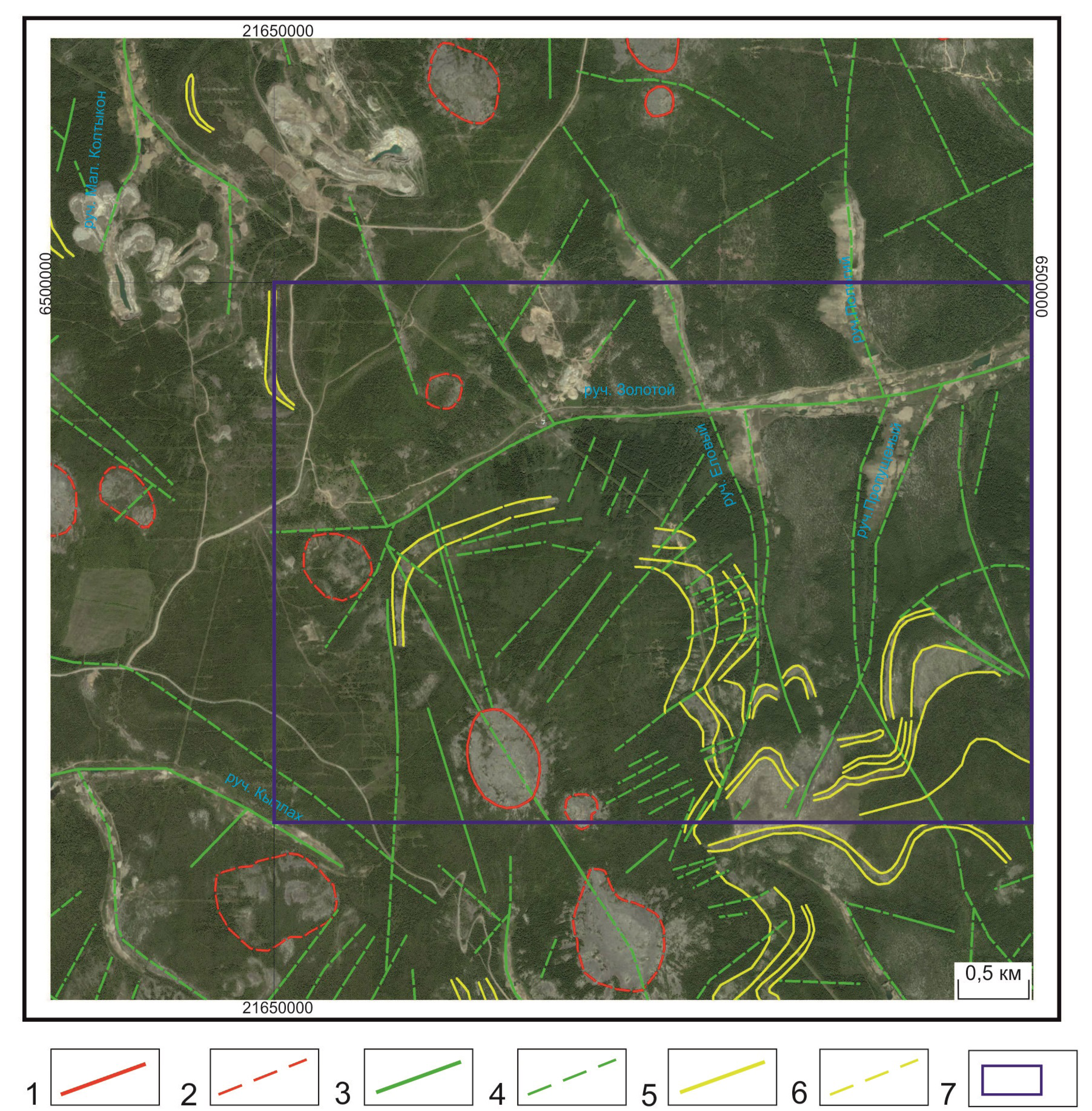 Структурные линии, соответствующие геологическим границам (контактам пород архейско-протерозойского кристаллического фундамента, венд-кембрийского осадочного чехла, мезозойских интрузивов), на космосхеме проявлены в различной степени. К северу от ручья Кыллах хорошо дешифрируются пластовые интрузивы. К сожалению, на большей части территории расшифровать структурные линии, отражающие геологические границы, не удается из-за интенсивной залесенности.