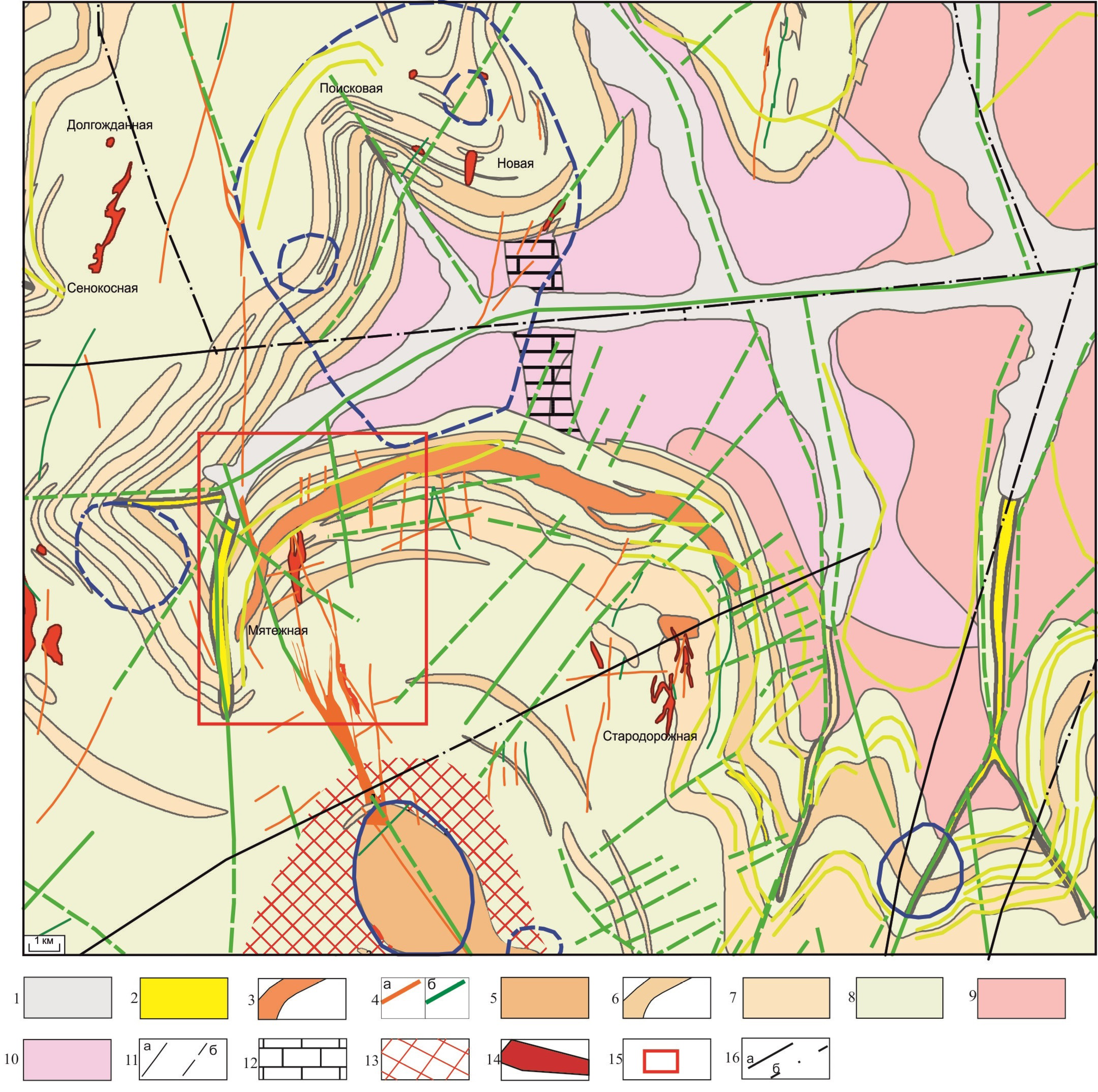 Рис. 4. Сопоставление данных космодешифрирования с геологическим строением Колтыкон-Самодумовского рудного поля (по данным ГДП‑200, В.А. Луконин и др., 1964 г.). 1 — техногенные (рыхлые) отложения; 2 — верхнечетвертичные образования нерасчлененные (аллювий пойм, русел); 3 — мезозойский вулкано-плутонический комплекс, дайки и силлы эгириновых бостонитов; 4 — колтыконский комплекс: а — дайки, пластовые интрузии роговообманковых сиенит-порфиров, б — субщелочных и щелочных лампроитов — минетт, вогезитов, керсантитов; 5 — лебединский комплекс — штоки, лакколиты щелочнополевошпатовых эгирин-авгитовых сиенитов; 6 — верхнеселегдарский комплекс — силлы роговообманковых, биотит-роговообманковых сиенит-порфиров, вогезитов; 7 — ороченский комплекс — силлы, лакколиты субщелочных и кварцсодержащих сиенит-порфиров, бостонитов; 8 — венд-кембрийская система, усть-юдомская свита — доломиты, битуминозные с прослоями оолитоподобных реже глинистых, известковистых доломитов; 9 — протерозойский магматический комплекс, ранний протерозой, граниты нерасчлененные щелочно-полевошпатовые, двуполевошпатовые; 10 — архей, федоровская серия нерасчлененная — роговообманковые, гиперстен-диопсид-роговообманковые, биотитовые, биотит-амфиболовые кристаллические сланцы, реже гнейсы, линзы кальцифиров мраморов; 11 — геологические границы: а — достоверные, б — предполагаемые; 12 — зоны мраморизации; 13 — зоны скарнирования; 14 — пирит-анкеритовые, пирит-анкерит-гематитовые, кварц-анкерит-гематитовые жилы-залежи; 15 — участок зоны Мятежной на схематическом плане (рис. 5); 16 — разрывные нарушения: а — установленные, б — предполагаемые под рыхлыми отложениями; остальные условные обозначения см. на рис. 5.