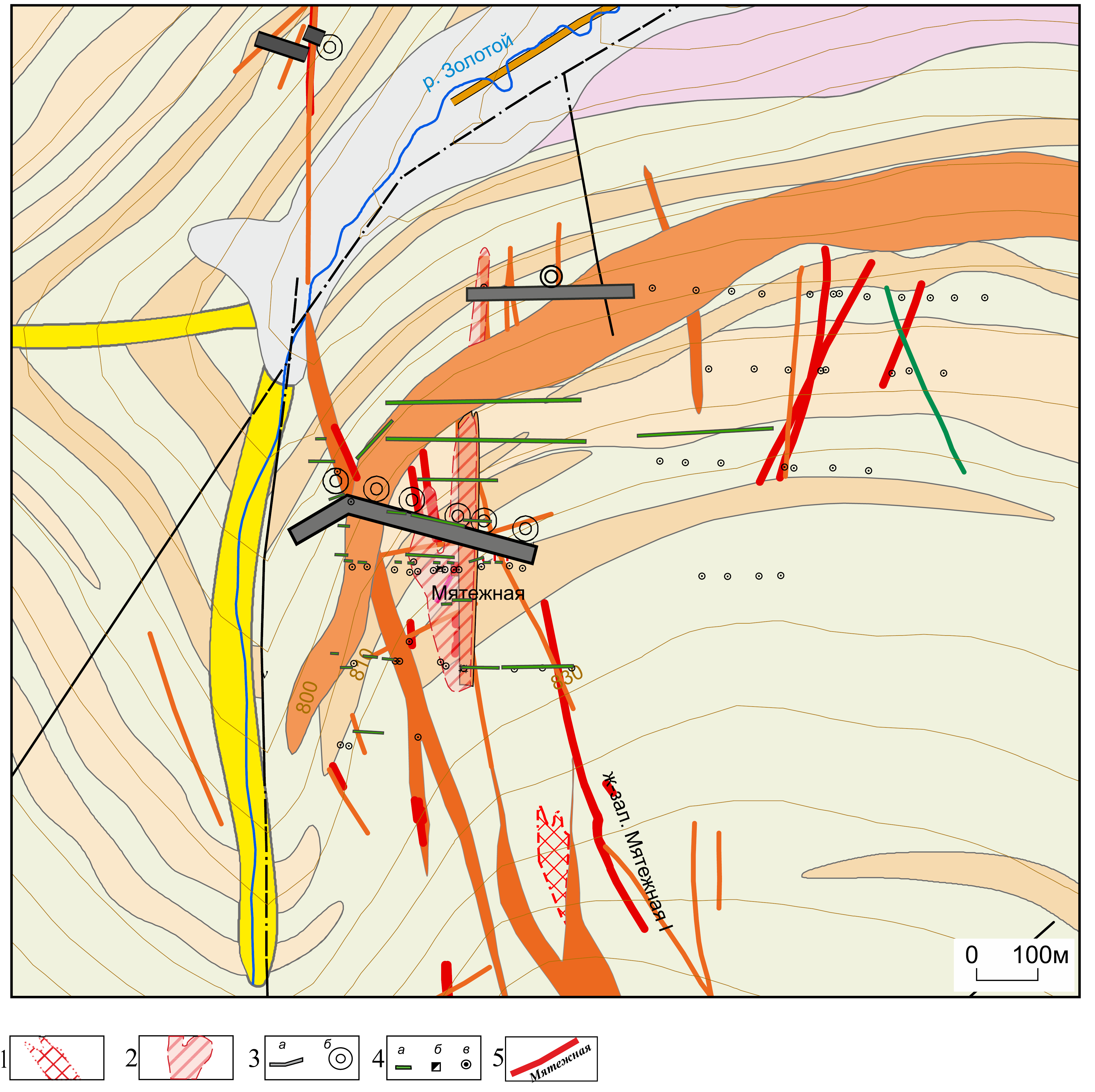 Рис. 5. Схематический геологический план поискового участка Мятежный. 1 — магнезиальные и известково-магнезиальные скарны; 2 — крутопадающие золоторудные зоны; 3 — канавы (а) и скважины (б) поисковых работ ФГУП ЦНИГРИ 2013–2015 гг.; 4 — канавы (а), шурфы (б), скважины (в) предшественников; 5 — разрывные нарушения: а — установленные, б — предполагаемые под рыхлыми отложениями; остальные условные обозначения см. на рис. 4.