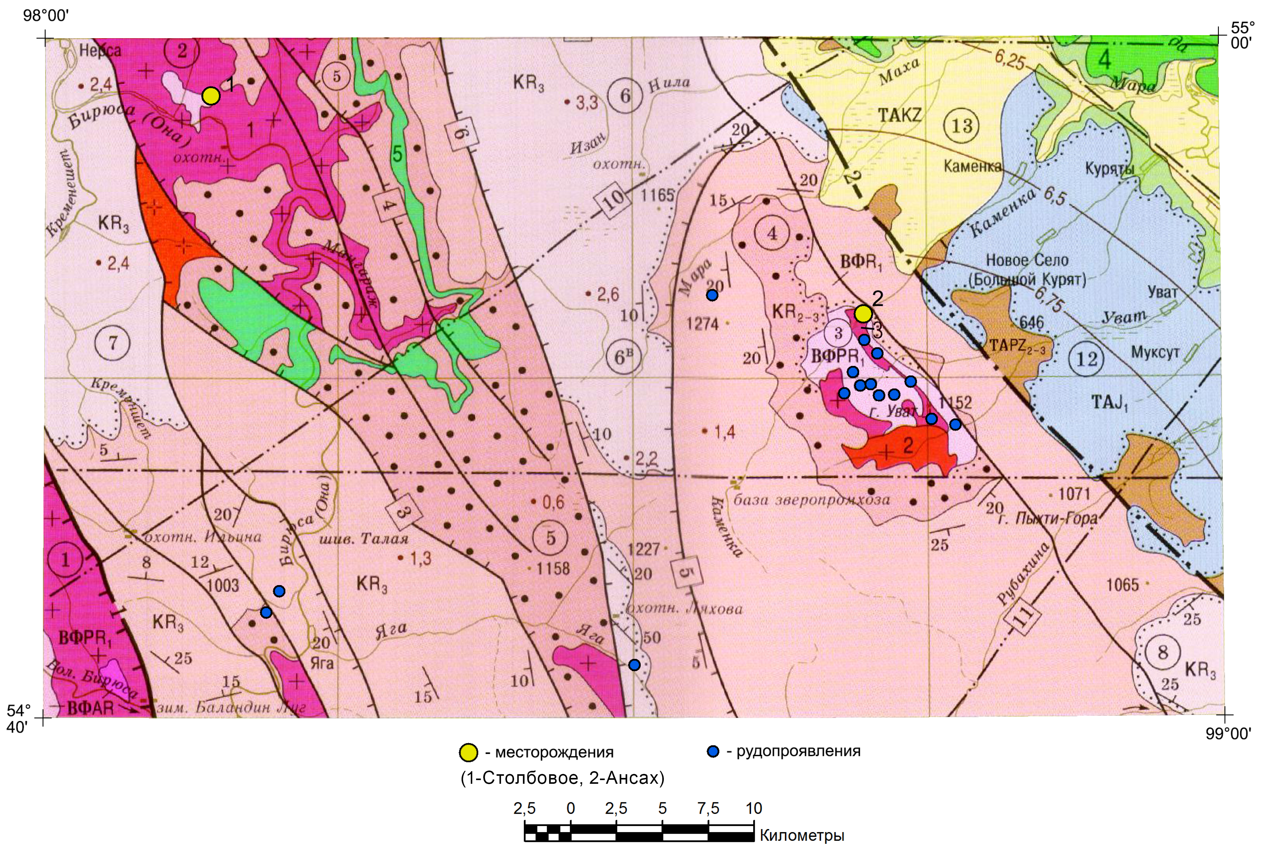 Большинство рудных объектов Бирюсинской площади расположено в поле слабоположительных значений магнитного и гравитационного полей, за исключением месторождения Столбовое, локализованного в области отрицательных значений гравитационного поля. Выявленные при дешифрировании площади повышенной плотности разломов характеризуются наличием зон катаклаза и метасоматической проработкой пород — калишпатизация, окварцевание. Наиболее перспективным по совокупности геофизических и структурных признаков является участок, расположенный в южной части Бирюсинского горст-антиклинального поднятия (рис. 4). Из разломов северо-восточного простирания самым протяженным является Катырминский (10) (рис. 1, 1б) разлом, трассирующийся вдоль р. Гаревая в центральной части площади работ. Нерсинско-Ягинский (3) (рис. 1, 1б) разлом по данным космодешифрирования представлен серией вытянутых в северо-западном направлении коротких дизъюнктивов, смещенных по разломам северо-восточного и субширотного простирания. В западной части площади работ расположена Кременьшетская (7) (рис. 1, 1б) грабен-синклиналь, в которой преобладают субпараллельные разломы северо-восточного простирания, отражающие пострифейские тектонические подвижки, а также дизъюнктивы северо-западного простирания, определяющие позицию гранитоидов саянского комплекса и границы линейных зон катаклаза и приразломного метасоматоза в юго-западной части площади.