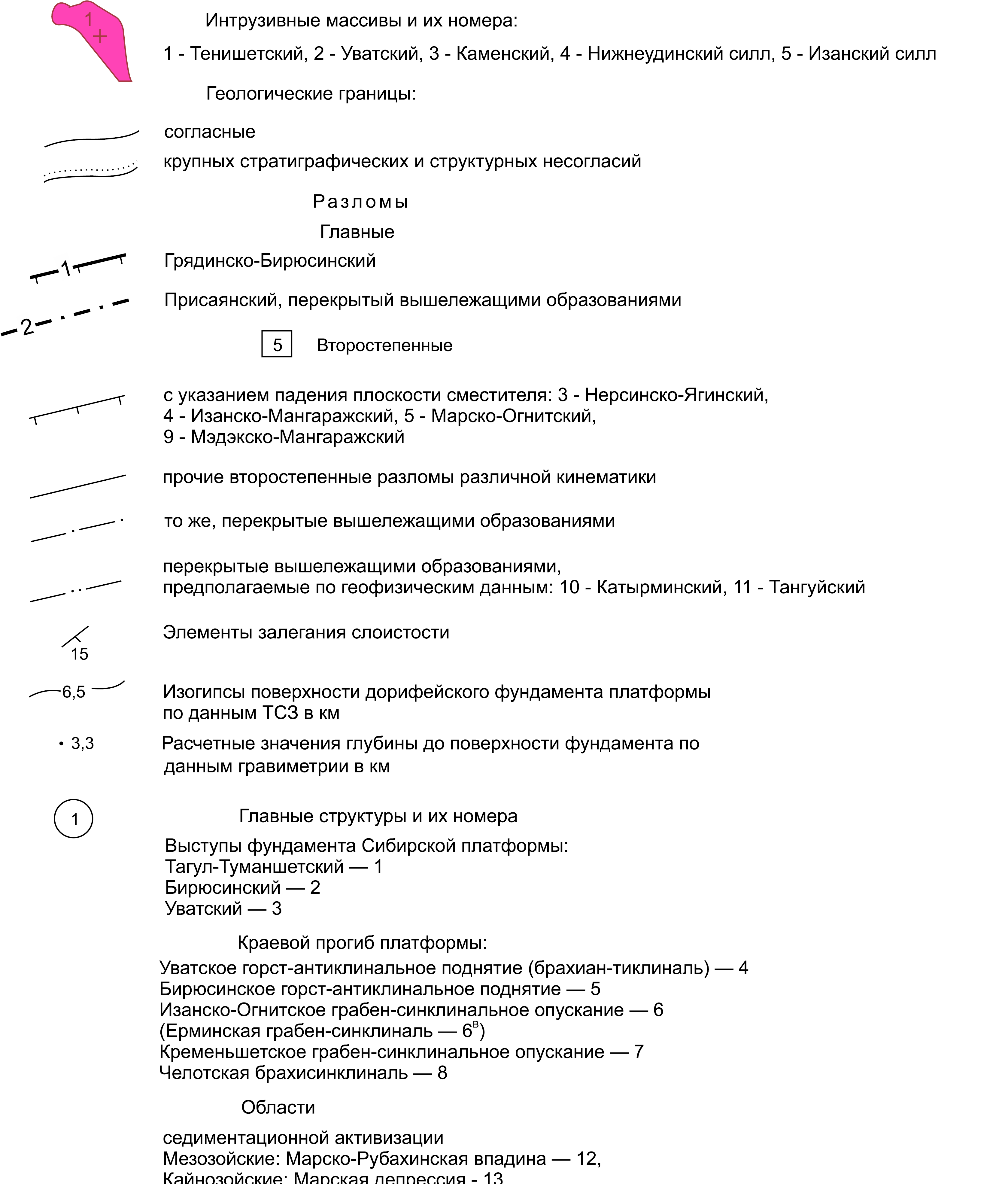 Центральную часть Бирюсинской площади занимает Изанско-Огнитская грабен-синклиналь (6), ограниченная Марско-Огнитским (5) и Мэдэкско-Мангаражским (9) разломами (рис. 1, 1б). Мэдэкско-Мангаражский разлом северо-западного простирания отчетливо дешифрируется по материалам космической съемки, а Марско-Огнитский разлом наблюдается фрагментарно, представляя, по сути, систему нескольких разломов субмеридионального и северо-восточного простирания. В пределах Бирюсинского горст-антиклинального поднятия (5) (рис. 1, 1б), расположенного к западу Мэдэкско-Мангаражского разлома, отмечаются две области повышенной плотности разломов северо-восточного и северо-западного простирания. Одна из них расположена в южной части поднятия в зоне примыкающей к Мэдэкско-Мангаражскому разлому, другая — в северной части поднятия по левобережью р. Бирюса, в поле развития гранитоидов Тенишетского массива (саянский комплекс) и в зоне их экзоконтакта в рифейских терригенных отложениях шангулежской свиты. Еще один участок повышенной плотности разломов, преимущественно северо-западного простирания, дешифрируется на правобережье р. Бирюса в поле развития габбро-долеритовых интрузий нерсинского комплекса и вмещающих их пород шангулежской свиты.