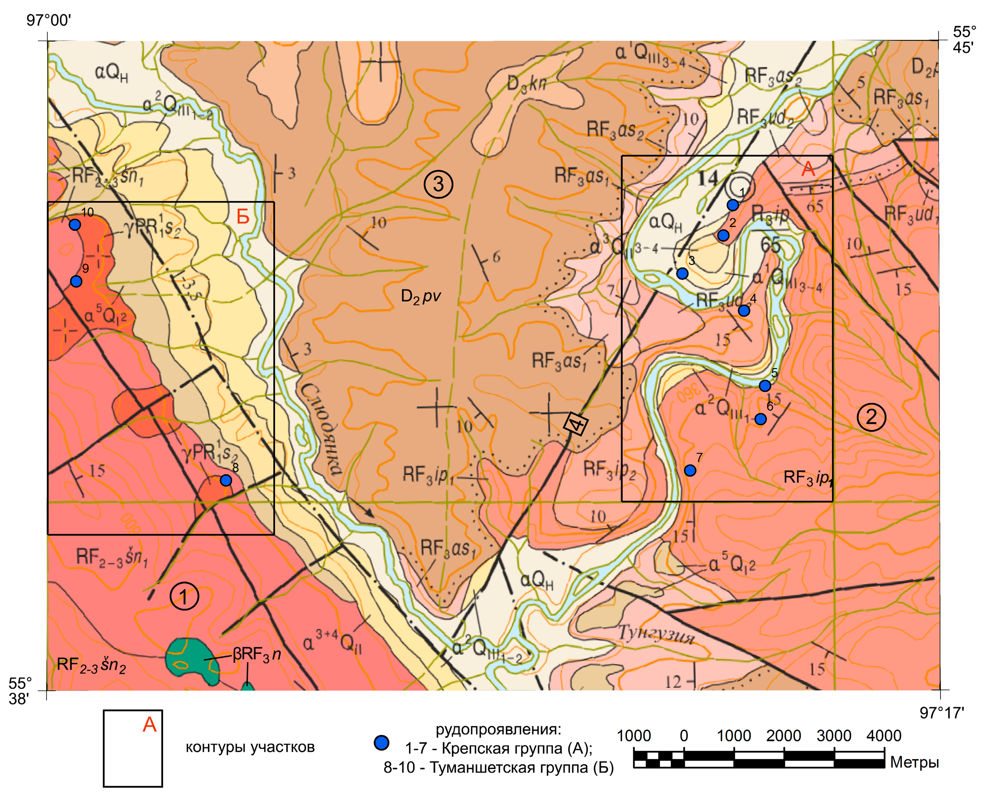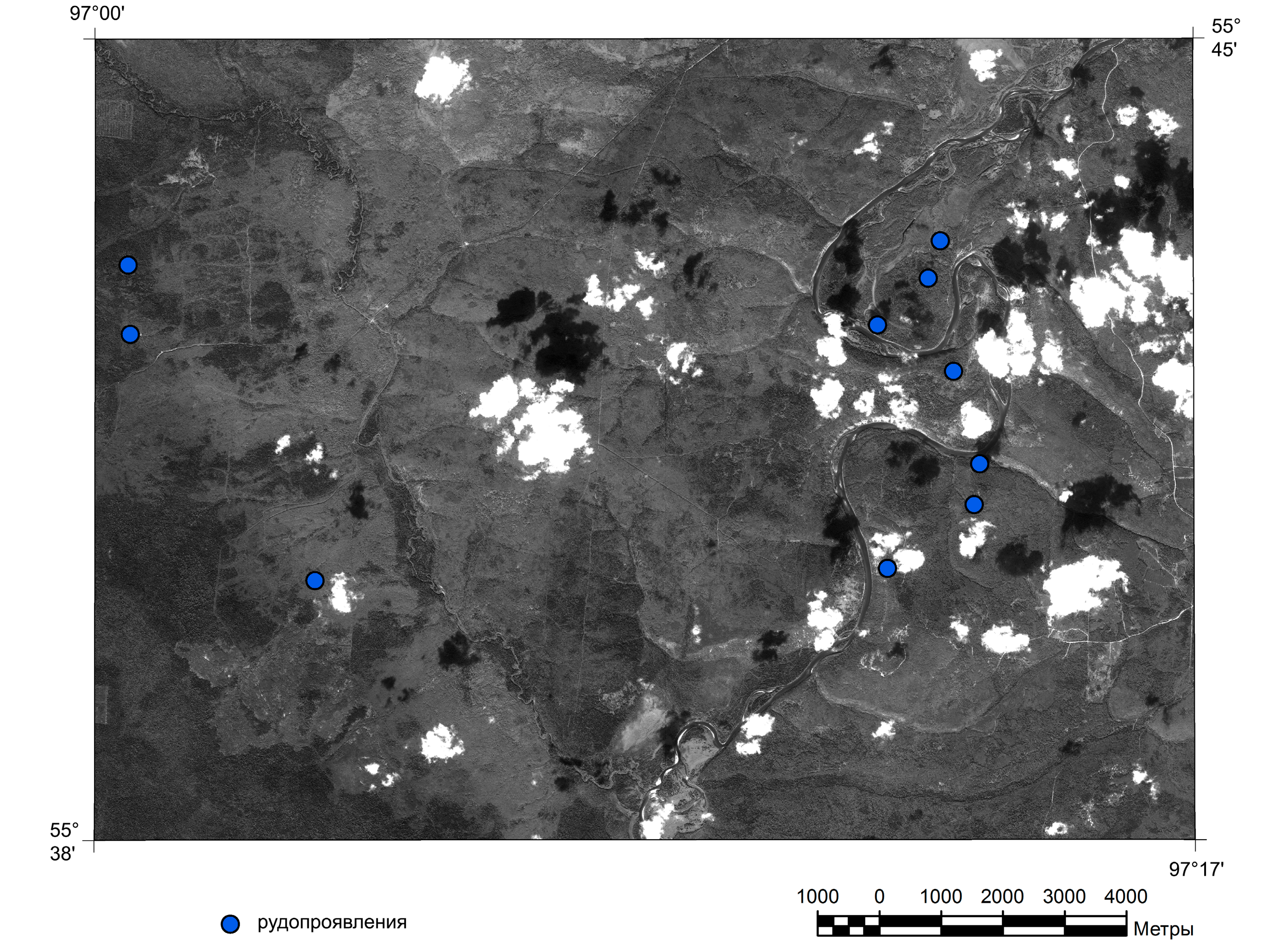 Исследование Крепско-Туманшетской площади выполнено с помощью космической съемки высокого разрешения “Ресурс-П” (Геотон) в панхроматическом (канал 10) и многозональном (каналы 21, 22, 23) режиме с разрешением на местности 1 и 3 м, соответственно (рис. 5). На исследуемой площади основными структурами являются Слюдянкинский выступ (1) и Большереченское антиклинальное поднятие (2), относящиеся к рифейскому структурному ярусу, а также Канско-Тасеевская впадина (3), сформированная в эпоху среднепалеозойской активизации (рис. 2, 2а). Канско-Тасеевская впадина, занимающая центральную часть площади, выполнена известняково-конгломерато-песчаниковыми отложениями девона (павловская свита). Юго-восточную часть площади занимают кремнисто-доломито-песчаниковые отложения Большереченского антиклинального поднятия (ипситская свита). Рудопроявления Крепской группы расположены в зоне контакта Большереченской и Канско-Тасеевской структур, фиксирующейся Каменским разломом (4) (рис. 2, 2а) северо-восточного простирания. Юго-западная часть исследуемой площади представлена карбонатно-терригенными отложениями шангулежской свиты Слюдянкинского выступа.