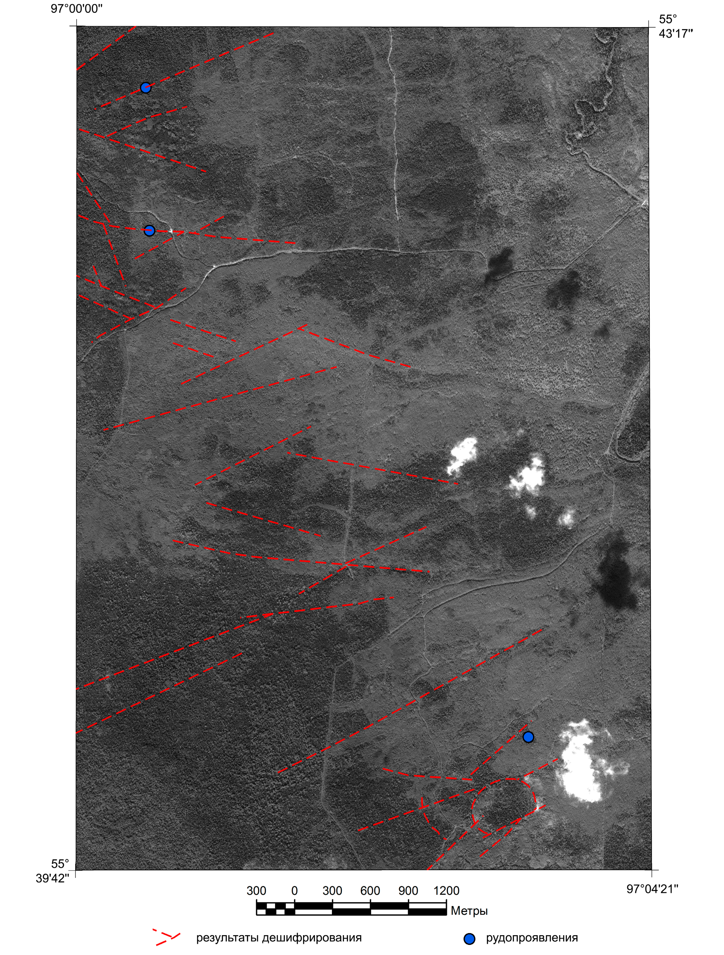 По данным космодешифрирования на Бирюсинской площади определены особенности тектонического строения горст-антиклинальных поднятий и разделяющих их грабен-синклиналей, показана большая роль субширотных дизъюктивов в структурном рисунке исследуемой площади, выделены рудоперспективные участки. На Крепско-Туманшетской площади рудоконтролирующими структурами являются небольшие по протяженности разломы субширотного простирания и узлы их пересечения с северо-западными и северо-восточными дизъюнктивами. Синтез изображений в различных каналах “Ресурс-П” может быть использован для литологического расчленения рудовмещающих пород и выявления рудоносных метасоматитов в зонах трещиноватости и брекчирования.
