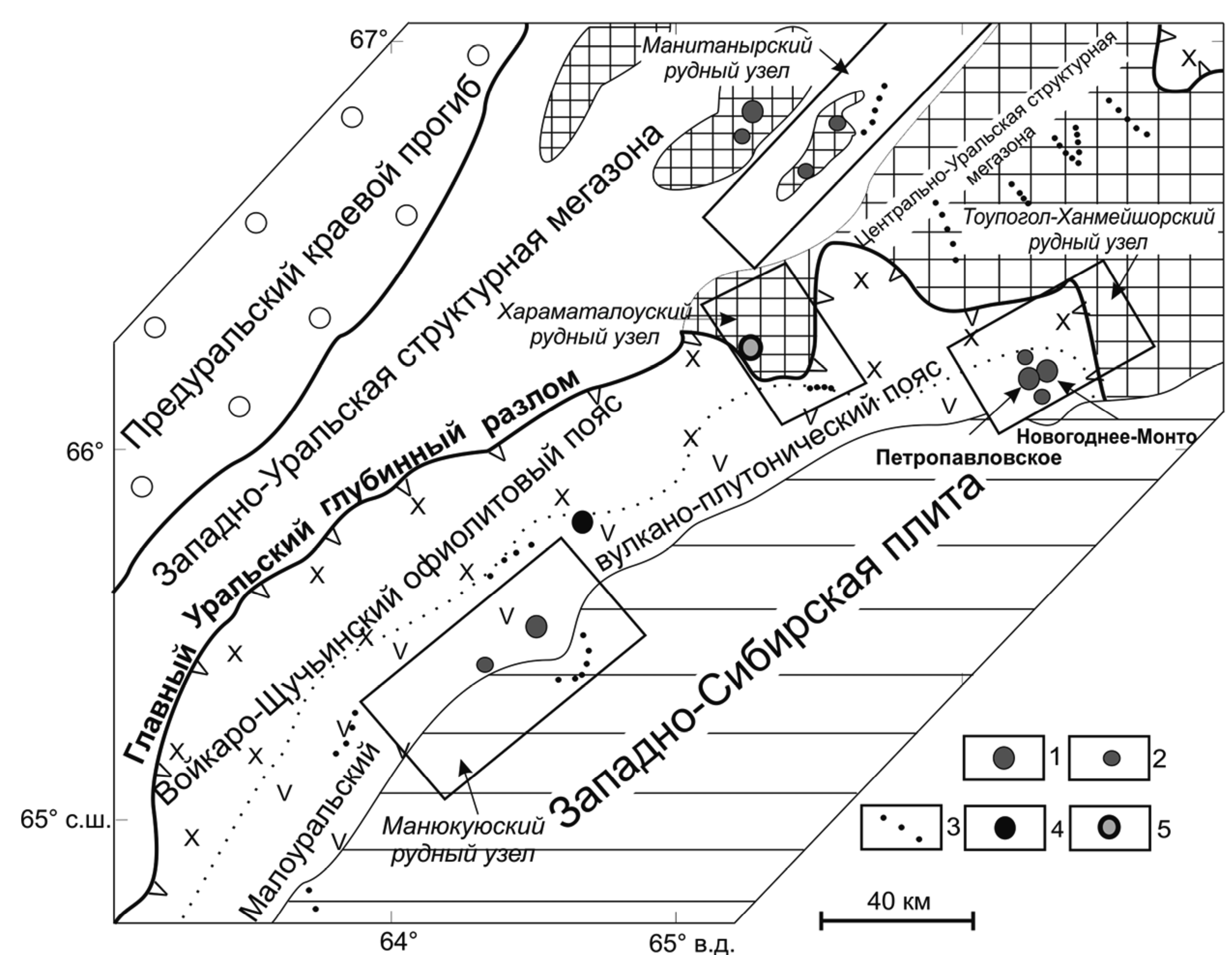 Рис. 1. Положение Петропавловского месторождения в Малоуральском ВПП. Структурная основа по (Черняев и др., 2005), с небольшими изменениями. 1–3 — месторождения (1), рудопроявления (2) и россыпи (3) золота; 4 — V-Fe-Cu-(Au) рудопроявление; 5 — Cu-Zn-колчеданное рудопроявление.