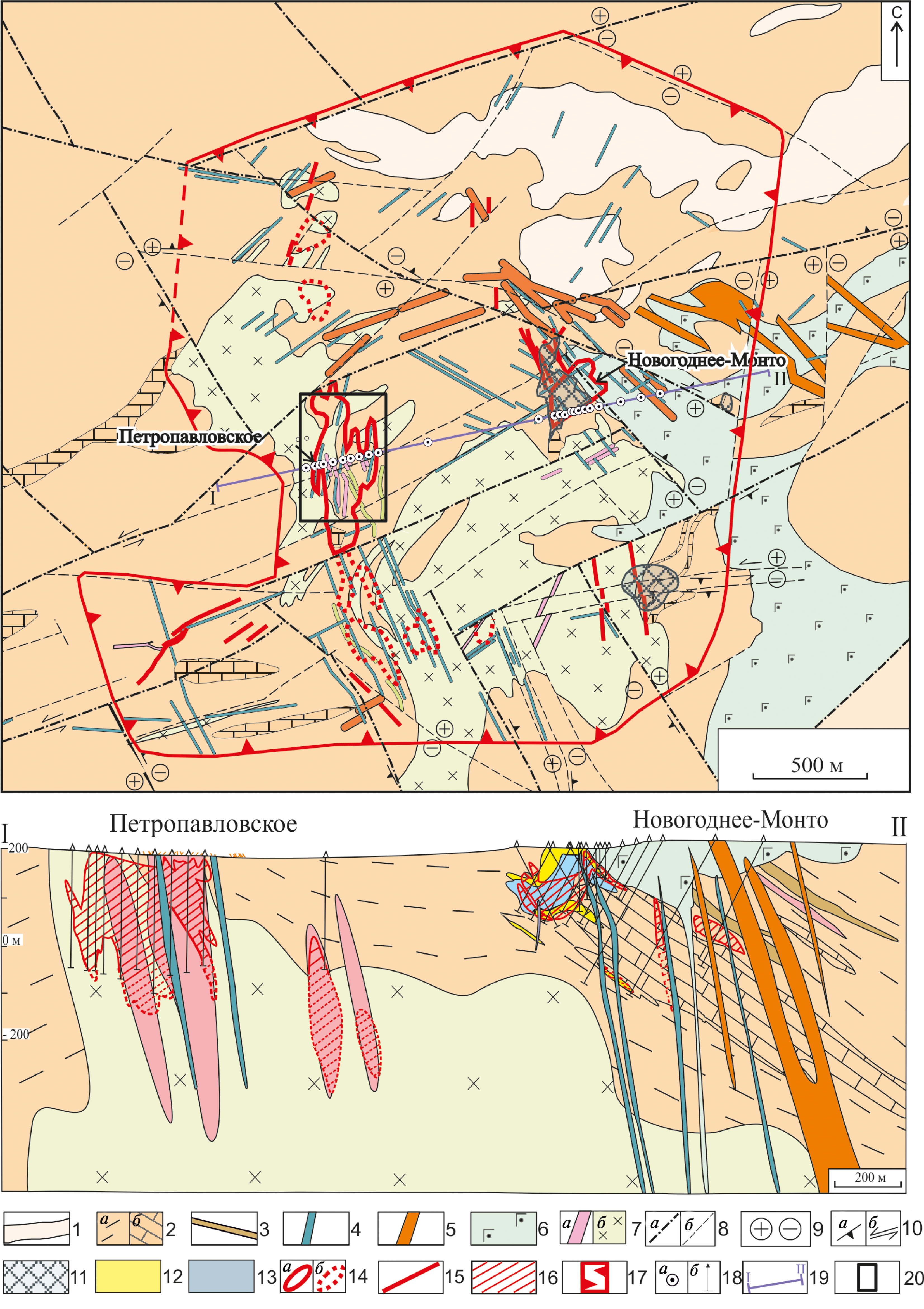Рис. 2. Геологическая карта Новогодненского рудного поля и геологический разрез по линии I–II (составлено с использованием данных А.Г. Волчкова и др. (ФГУП ЦНИГРИ, 2008), Р.Х. Мансурова, 2013; ОАО «Ямалзолото». 1–3 — стратифицированные образования: 1 — тоупуголегартская толща (D1–2tg): известняки, алевролиты, аргиллиты, песчаники; 2–3 — тоупугольская толща (S2–D1tp): 2 — вулканогенно-осадочные и вулканические породы андезибазальтового состава (а), известняки мраморизованные (б), 3 — андезибазальты (на разрезе); 4–7 — интрузивные образования: 4 — малоханмейский габбро-долеритовый комплекс (D3–Tm?): дайки микрогаббро; 5–6 — конгорский габбро-монцонитовый комплекс (D3–C1k): 5 — монцодиориты, 6 — микрогаббро; 7 — собский габбродиорит-плагиогранодиоритовый комплекс (D1–2s): а — 3-я фаза внедрения: кварцевые диоритовые порфириты, плагиогранит-порфиры, б — 2-я фаза внедрения: габбро-диориты, кварцевые диориты порфировидные; 8 — разрывные нарушения: а — главные, б — второстепенные; 9 — направления падения сместителей разрывных нарушений; 10 — относительные смещения по разрывным нарушениям: а — вертикальные, б — горизонтальные; 11–13 — рудно-метасоматические образования: 11 — скарны эпидот-гранат-пироксеновые с золото-сульфидно-магнетитовой минерализацией (проекция на поверхность); 12 — эпидот-гранат-пироксеновые скарны (на разрезе); 13 — магнетитовые тела (на разрезе); 14 — штокверкоподобные золоторудные зоны: а — месторождений Петропавловское и Новогоднее-Монто, б — северного и южного флангов Петропавловского месторождения (прогнозируемые); 15 — основные линейные золоторудные жильно-прожилковые зоны жильного типа (в том числе прогнозируемые); 16 — зоны золото-сульфидной минерализации; 17 — контур Новогодненского рудного поля; 18 — буровые скважины: а на плане, б — на разрезе; 19 — линия разреза.