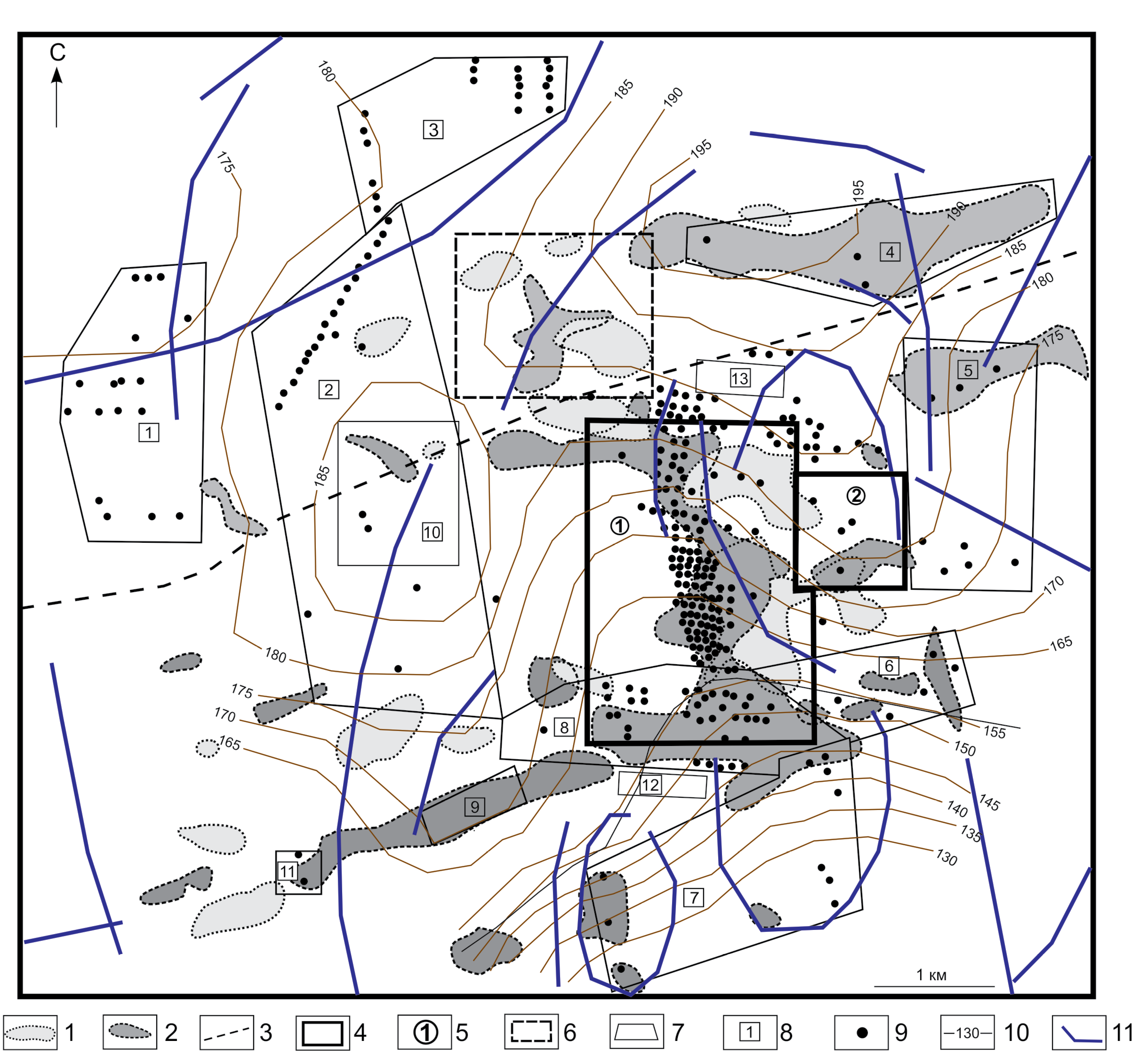 Рис. 3. Карта расположения аномалий НС и ВП для Тоупугол-Ханмейшорского рудного района (геофизическая основа по Бутаков и др., 2012) с вынесенными морфоструктурами, полученными в процессе космодешифрирования. 1–3 — геофизические аномалии: 1 — аномалии НС; 2 — аномалии ВП; 3, 4 — границы: 3 — рудных полей (на севере — Ханмейшорское, на юге — Новогодненское); 4 — месторождений Новогоднее-Монто и Петропавловское; 5 — месторождения: 1 — Петропавловское, 2 — Новогоднее-Монто; 6 — границы перспективной Северо-Западной зоны, выявленной в ходе геофизических работ; 7, 8 — поисковые участки: их границы (7) и названия (8), участки: 1 — Тоупугольский, 2 — Аномальный, 3 — Ханмейшорский, 4 — Северный, 5 — Структурный, 6 — Караченцева, 7 — Придорожный, 8 — Карьерный, 9 — Линейный, 10 — Сипугольский, 11 — Медный, 12, 13 — Западный (12 ‒ южный фланг, 13 — северный фланг); 9 — скважины; 10 — изолинии поверхности рельефа; 11 — морфоструктуры, вынесенные с рис. 4а.