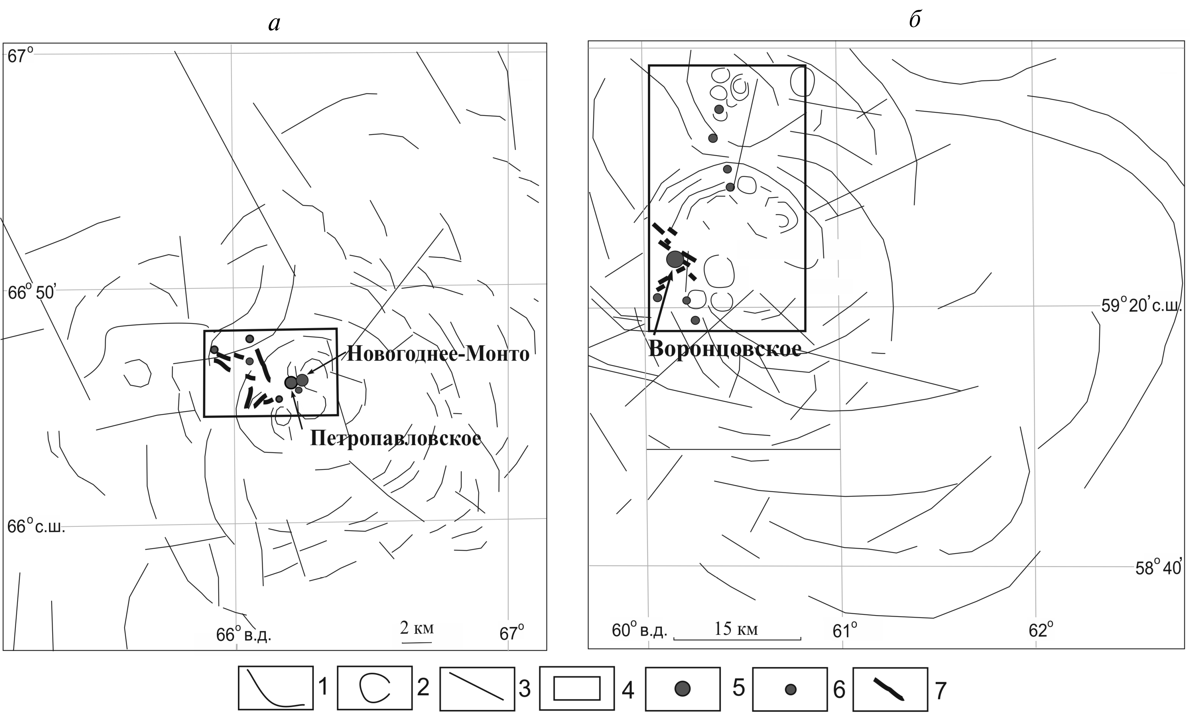 Рис. 4. Дешифрирование космоснимков Тоупугол-Ханмейшорского (а) и Турьинско-Ауэрбаховского рудных районов (б). 1–3 — линеаменты: 1 — концентрические морфоструктуры 1 и 2-го порядков; 2 — морфоструктуры центрального типа 3-го порядка; 3 — радиальные морфоструктуры; 4 — контуры рудных районов; 5 — золоторудные месторождения; 6 — золотопроявления; 7 — внемасштабные субвулканические тела порфиритовых диоритов по Прямоносов и др., 2001; Петров и др., 2011.