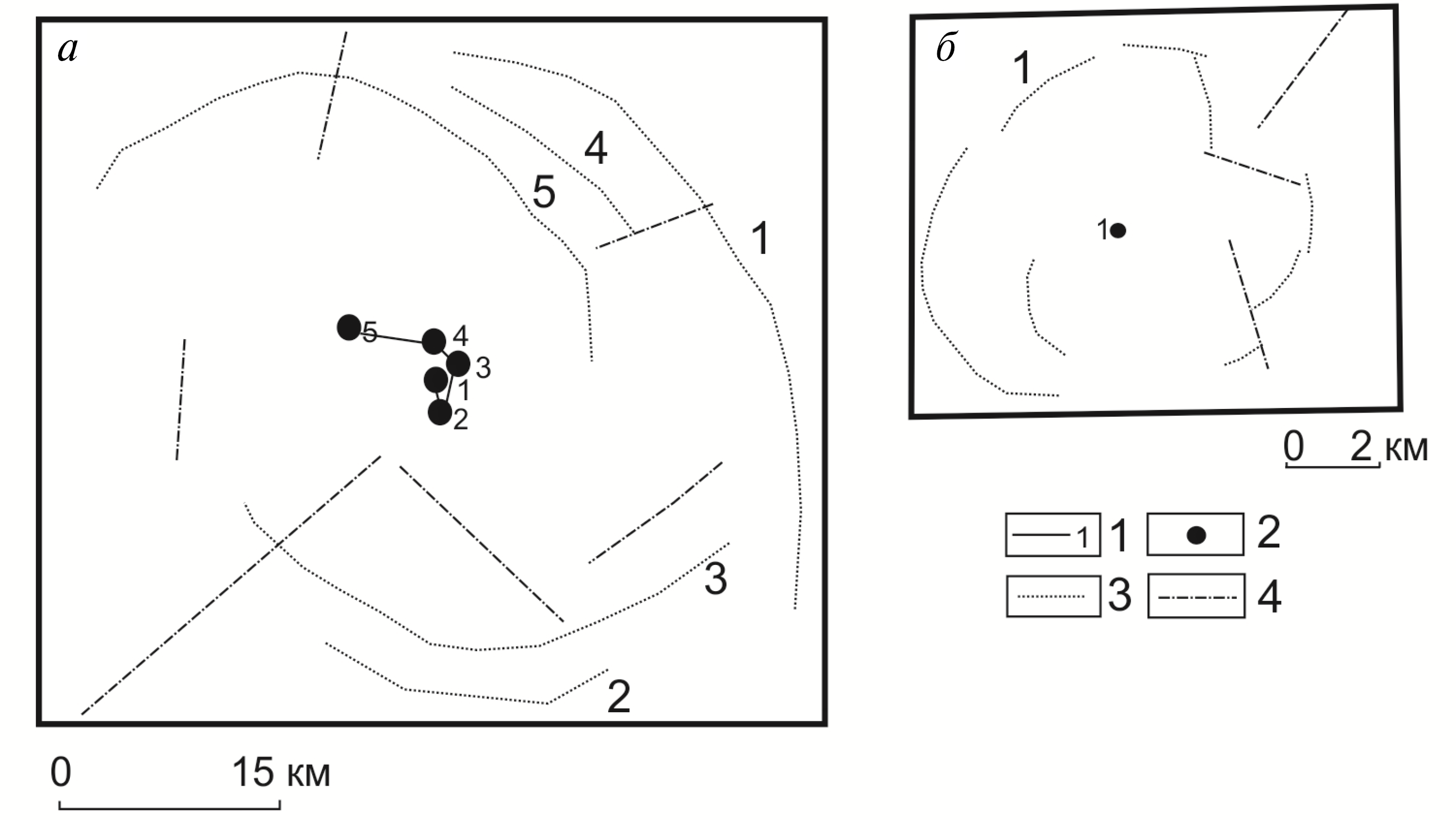 Рис. 5. Морфометрические модели кольцевых структур Аурбаховского (а) и Новогодненского (б) рудных полей: 1 — проекция на дневную поверхность траектории изменения положения магматического очага в Воронцовском рудном поле (а); 2 — центроиды кольцевых структур и их номера; 3 — основные кольцевые структуры и их номера; 4 — главные линеаменты рудных районов.