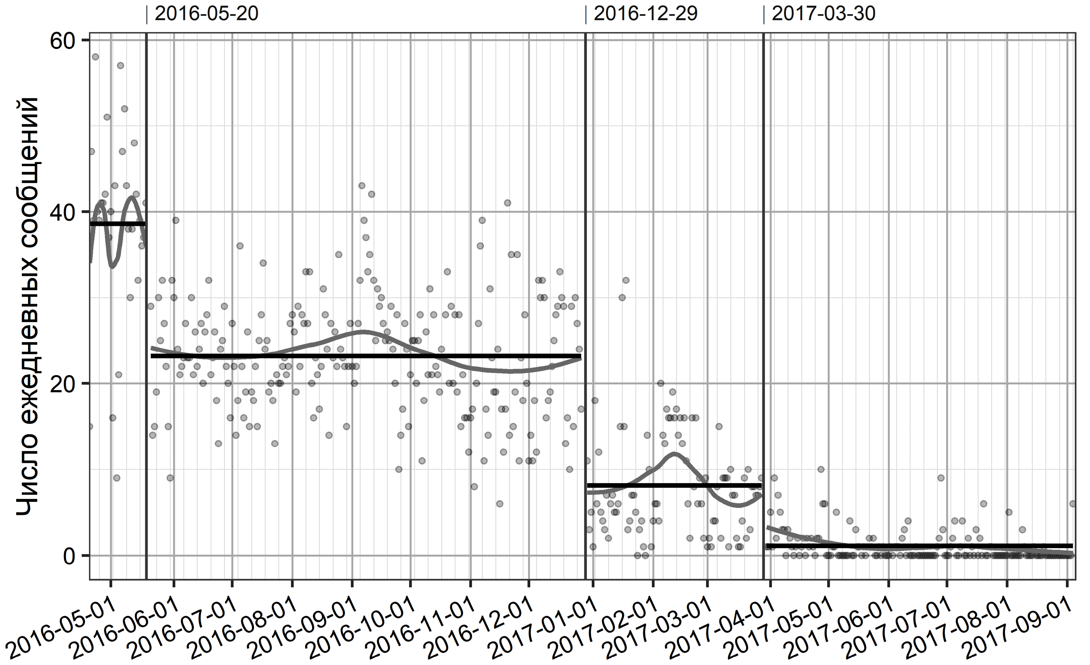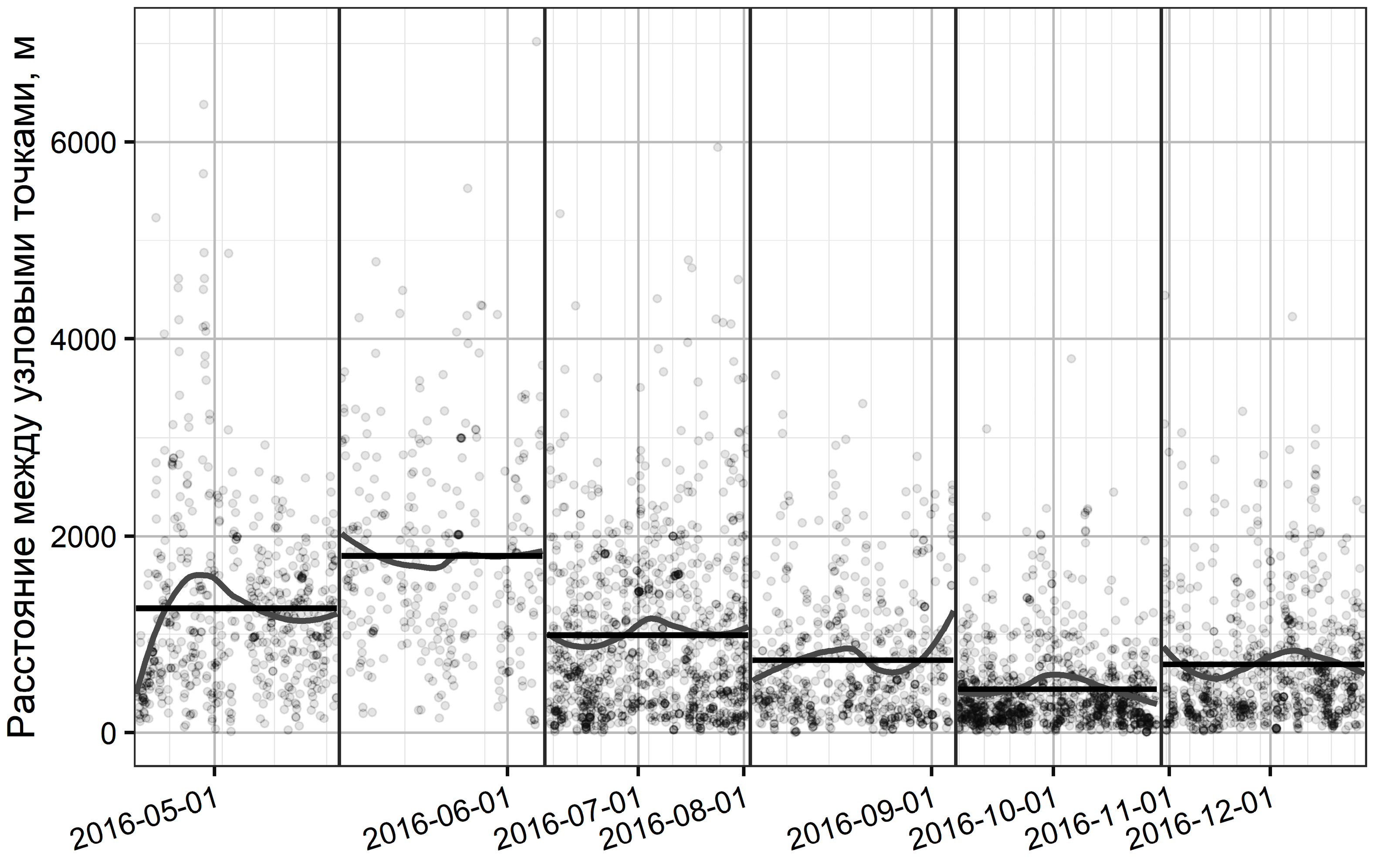 Уменьшение частоты сообщений приводит к увеличению ошибки оценки усредненного местоположения за определенный интервал времени. Поэтому были выделены периоды, в течение которых частота сообщений, в среднем, не сильно отличалась для дней, относящихся к данному периоду, и периоды, в течение которых она имела значительные расхождения, в среднем, с днями, не относящимися к данному периоду. Для этого использовали метод поиска структурных изменений (Zeileis et al., 2003), основанный на определении временны́х периодов таким образом, чтобы сумма среднеквадратической ошибки отклонений от линейной регрессии при нулевом значении коэффициента наклона прямой для всех периодов была минимальна. Верификация полученных результатов, проведенная методом сегментации на основе штрафной функции контрастов (Lavielle, 1999, 2005) по обнаружению отличий в средних значениях, показала, что оценки границ сегментов совпали.