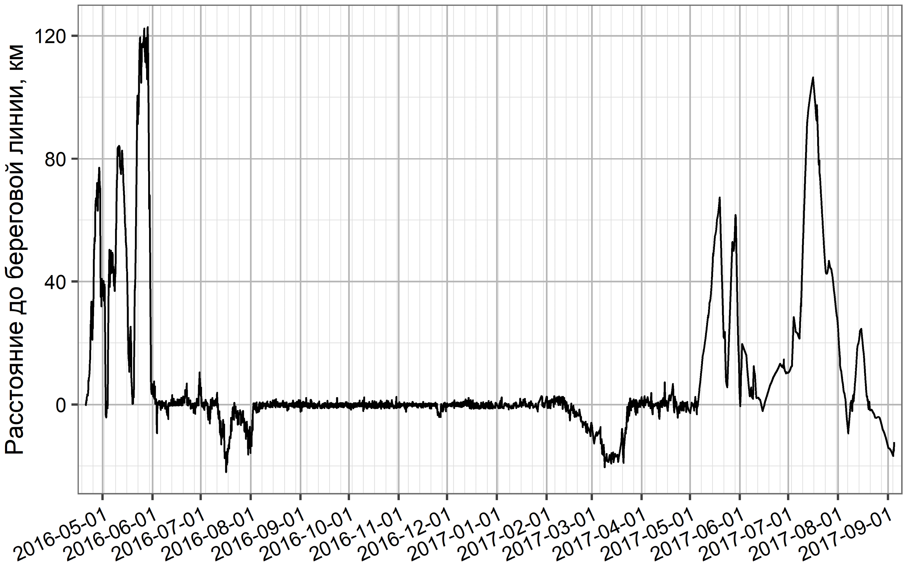 Приверженность береговой линии. При заданной буферной зоне береговой линии в 1.0 км (0.5 км вглубь побережья и 0.5 км в сторону морского льда) самка белого медведя с медвежатами провела на береговой линии 137.0 дней (27.3% времени отслеживания перемещения), на суше 165.4 дня (32.9%) и на покрытой и непокрытой льдами морской акватории 200.1 дня (39.8%). В периоды с 11.07.2016 г. по 2.08.2016 г. и с 12.02.2017 г. по 25.03.2017 г. отмечены наиболее значительные проникновения самки белого медведя вглубь суши — на расстояние до 15–20 км (рис. 2).