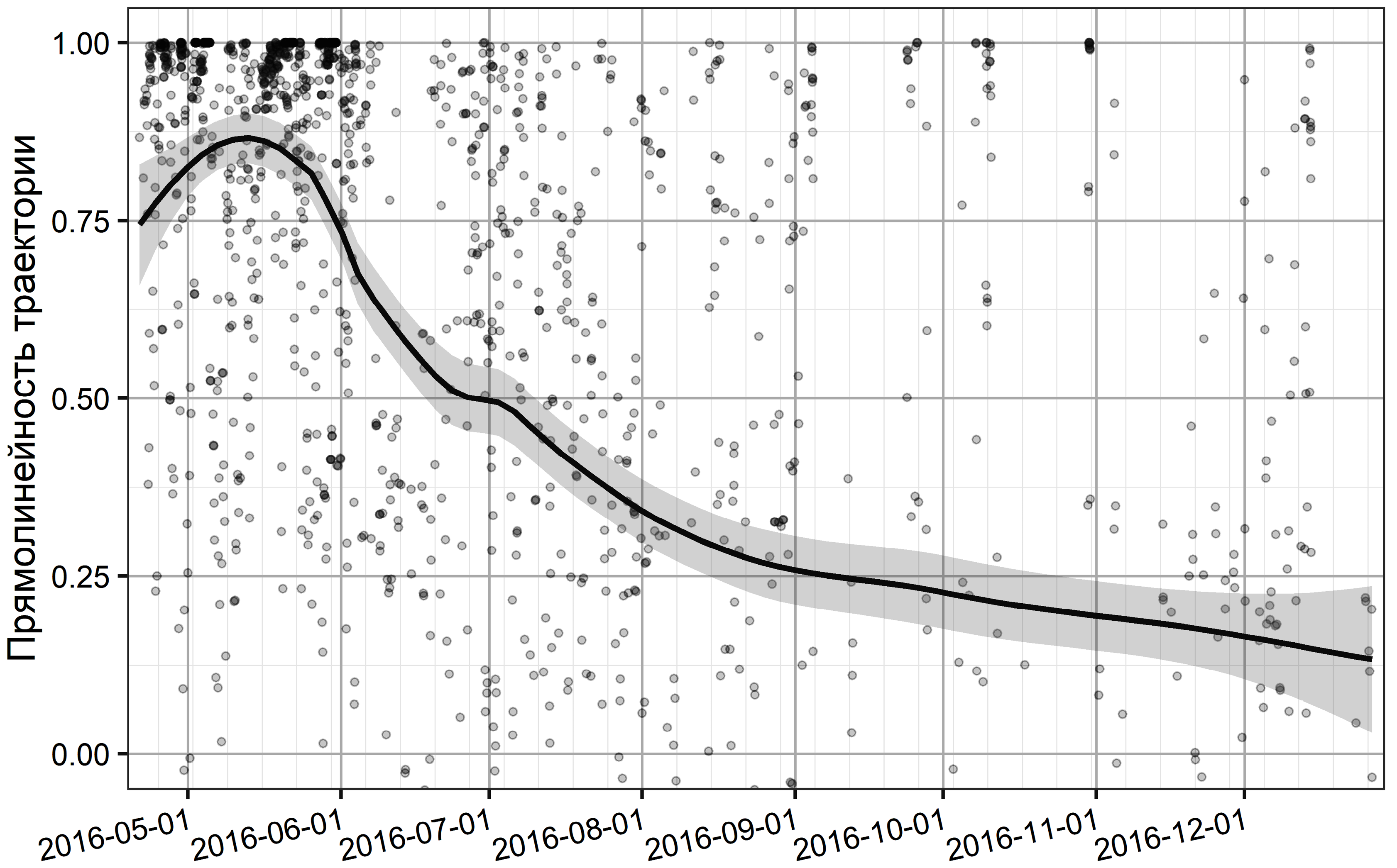 Рис. 3. Изменение прямолинейности траектории самки белого медведя.