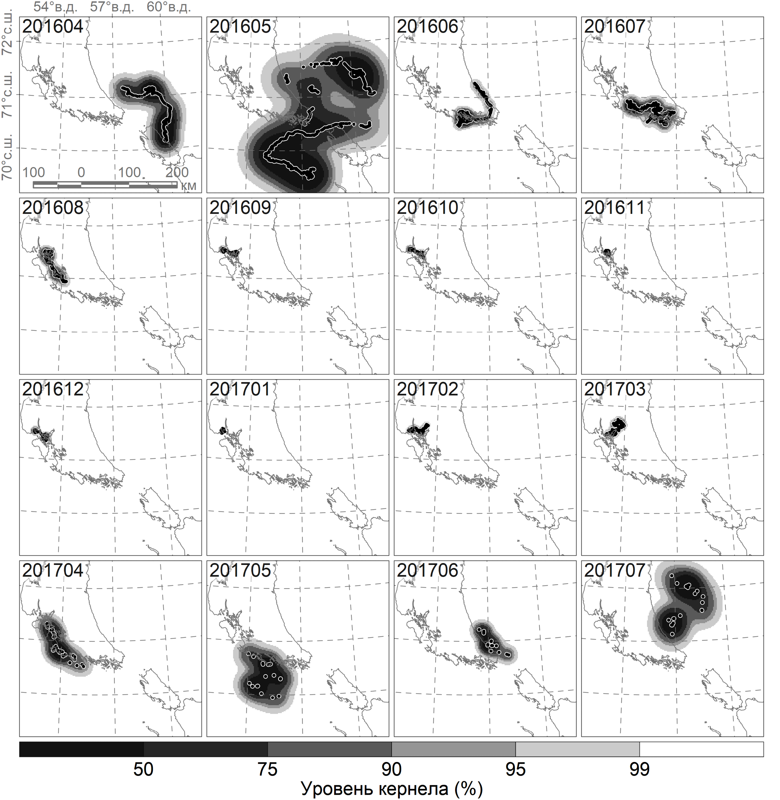 На рис. 2 для этого периода отсутствуют перемещения как вглубь суши, так и вплавь между островами. Увеличение участка в июле 2016 г. вызвано продолжительными заходами вглубь суши в юго-западной части Новой Земли для вероятной добычи яиц птиц и молодняка наземных животных. С сентября 2016 г. по февраль 2017 г. активность перемещения падает, участок обитания уменьшается значительно, достигая минимальной площади в январе. С середины марта 2017 г. (рис. 2) подвижность возрастает в связи с тем, что медведица начинает исследовать покрытую льдом прибрежную акваторию. В апреле 2017 г. ее перемещение осуществляется в меридиональном направлении в 15–20 км от берега, а в мае активней использует морской лед Баренцева моря. В июне 2017 г. участок обитания уменьшается за счет использования прибрежной акватории Карского моря, а в июле его площадь возрастает за счет активного освоения акватории к востоку от о. Южный.
