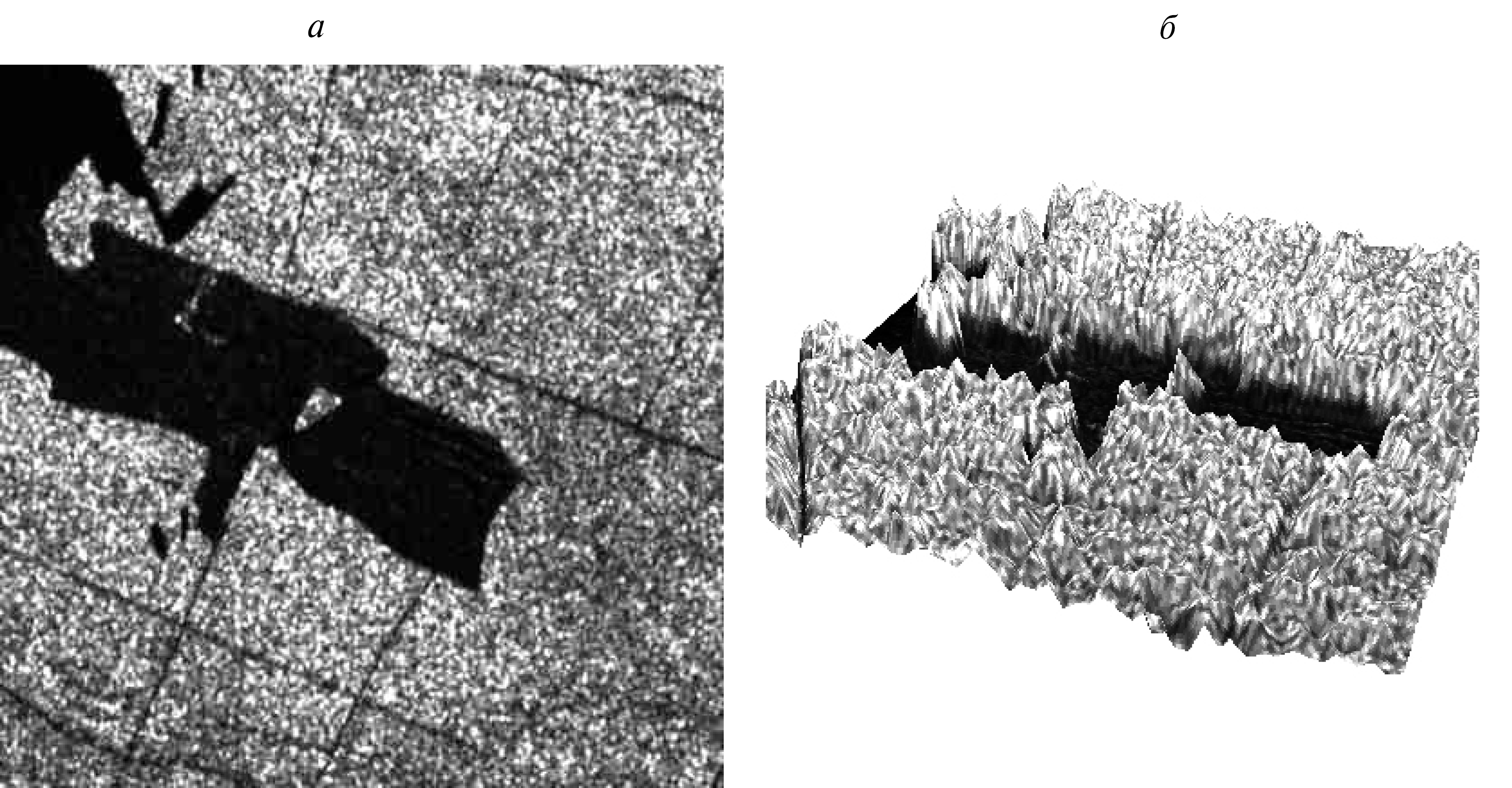 Рис. 2. а — фрагмент радарного изображения в дециметровом диапазоне длин волн; б — его трехмерное представление.