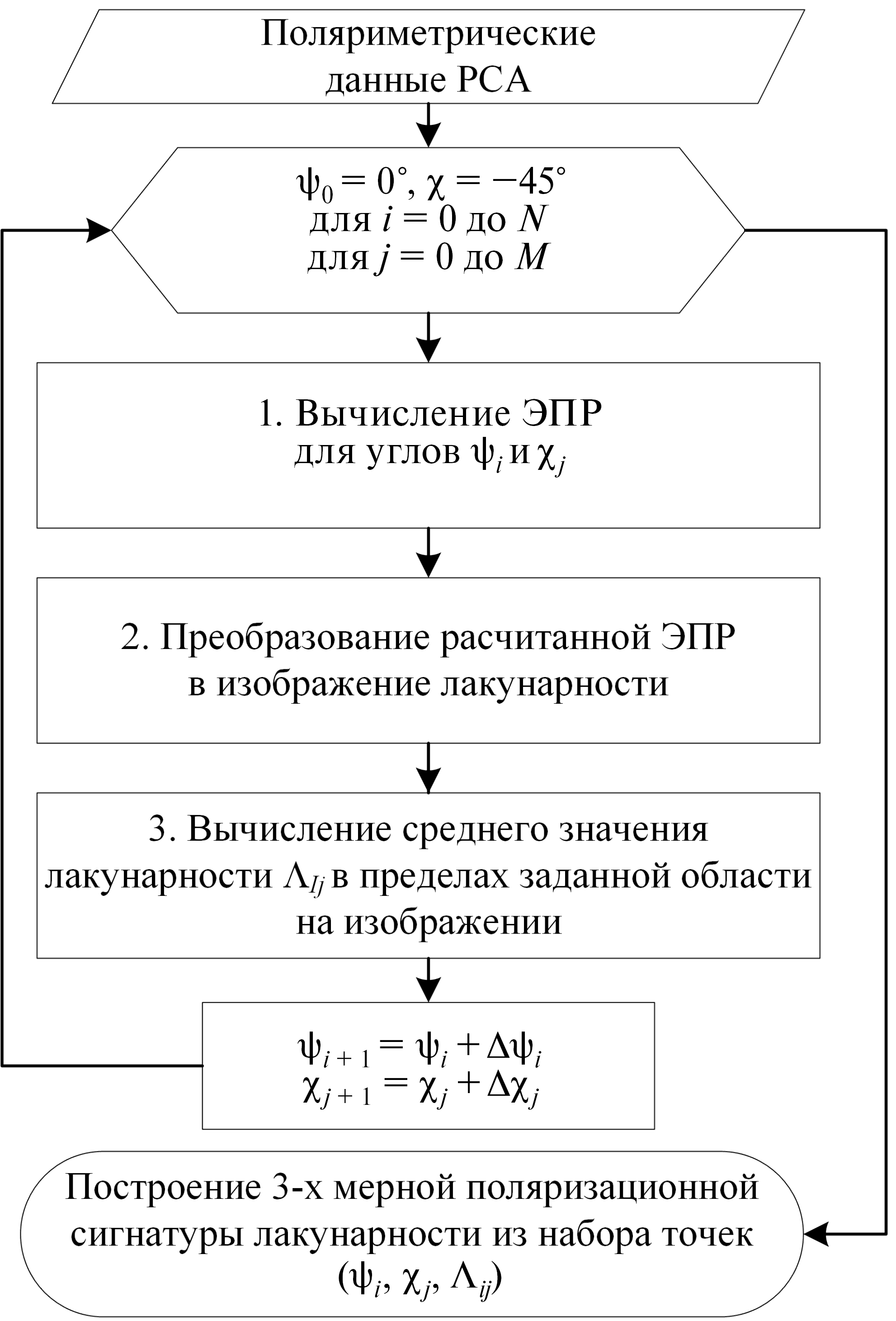 Для каждой комбинации углов (ψi, χj) в соответствии с работой (Van Zyl et al., 1987) вычисляется со- или кросс-поляризационная ЭПР. Затем, рассчитанные ЭПР преобразуются в изображения лакунарности с помощью алгоритма, описанного выше.