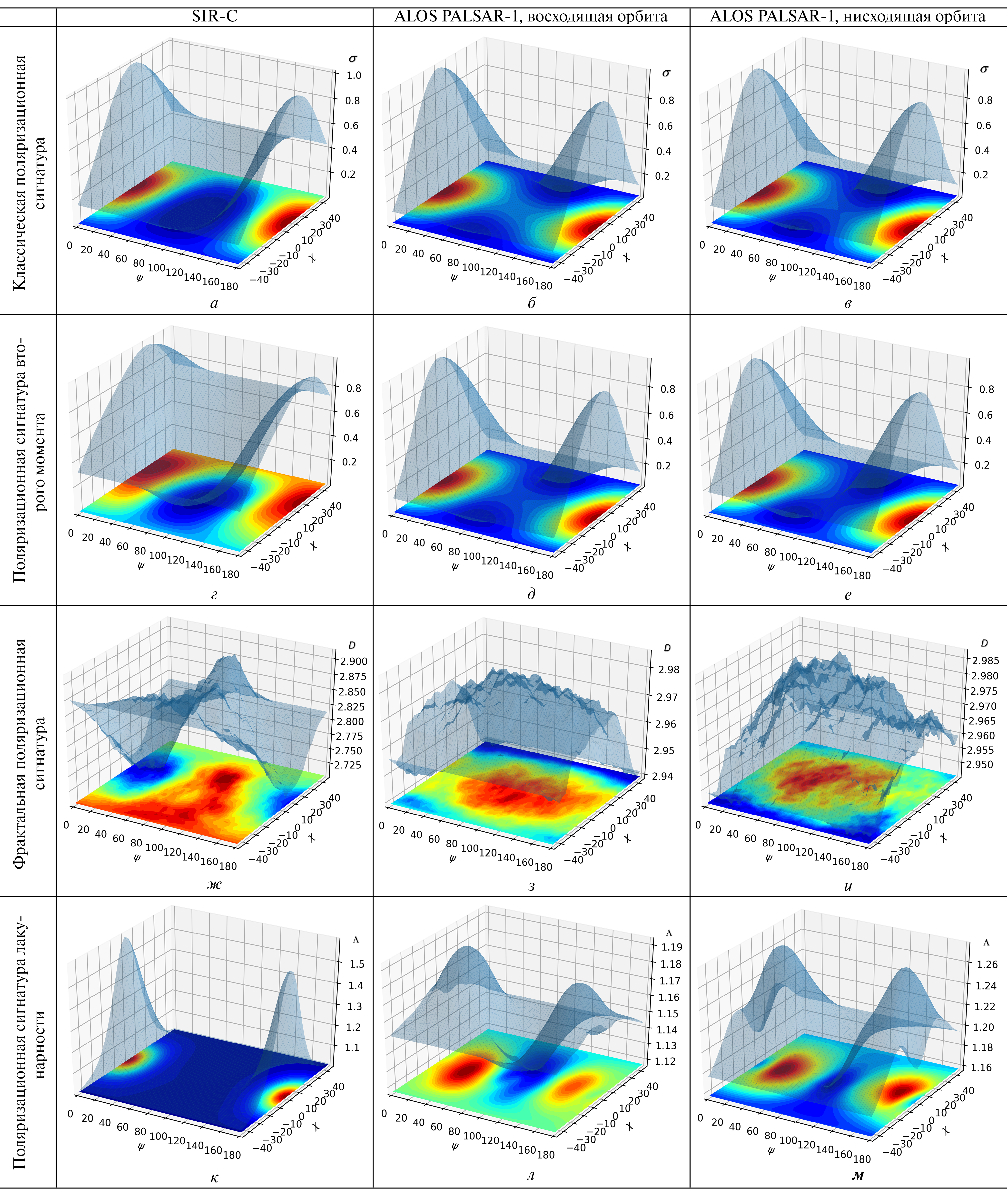 На рис. 6 по оси абсцисс отложен угол ориентации эллипса поляризации, по оси ординат — угол эллиптичности, по оси аппликат для классической сигнатуры — усредненная нормированная величина обратного радарного рассеяния, для фрактальной — фрактальная размерность, а также соответственно нормированная величина второго момента и величина лакунарности. Представленные сигнатуры получены усреднением данных раздельно для трех направлений радиолокационного зондирования.