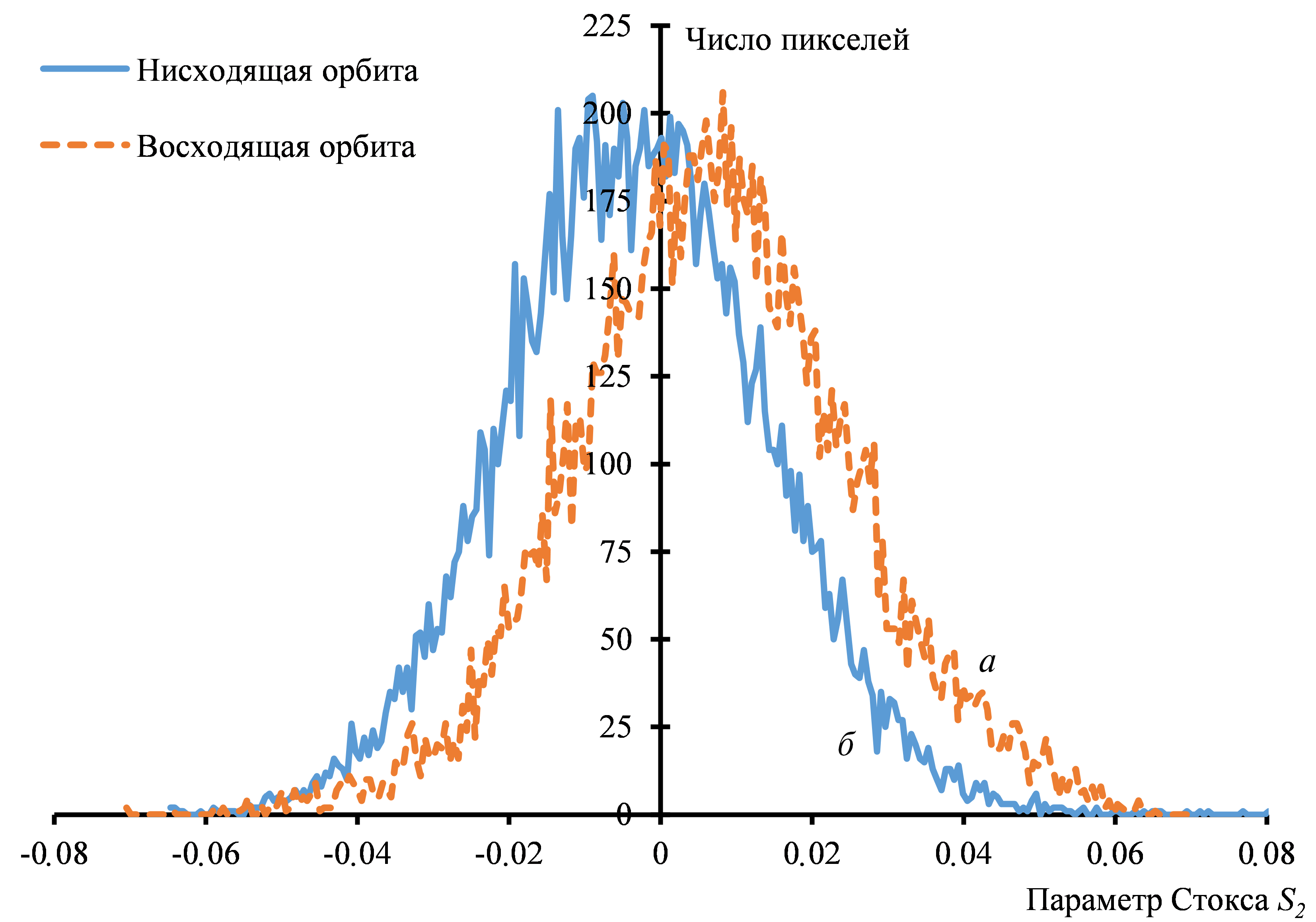 Сравним полученные выше результаты с использованием данных спутника ALOS PALSAR, с одним из традиционных способов оценки состояния поляризации. Рассмотрим гистограммы распределения значений 3-го параметра Стокса по изображениям тестового участка (см. рис. 7). Третий параметр Стокса S2 характеризует соотношение компонент, линейно поляризованных под углами (с азимутами) +45° или –45°. Существуют следующие три случая для величин S2: