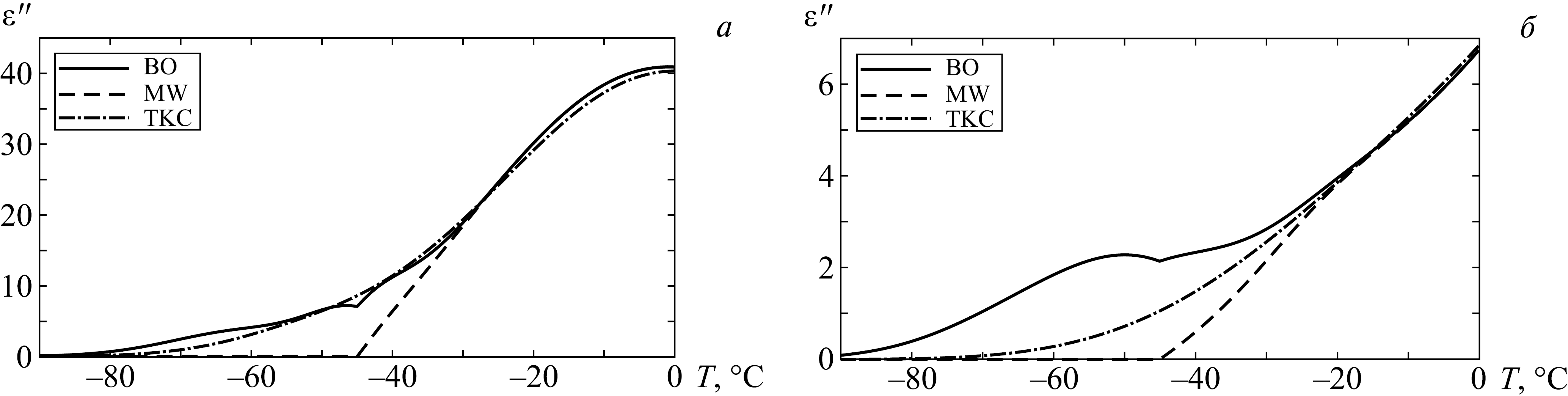 3. На графиках воды по результатам уточнений работы (Бордонский и др., 2017) имеется область немонотонных изменений величины вблизи − 45 °C. Это связано с тем, что при вычислениях использованы результаты работы (Meissner, Wentz, 2004), для которых на этих зависимостях имеет место резкий перегиб значений величины. Для уточнения поведения вблизи − 45 °C требуются специальные исследования и с высокой точностью задания температуры в объеме образцов.