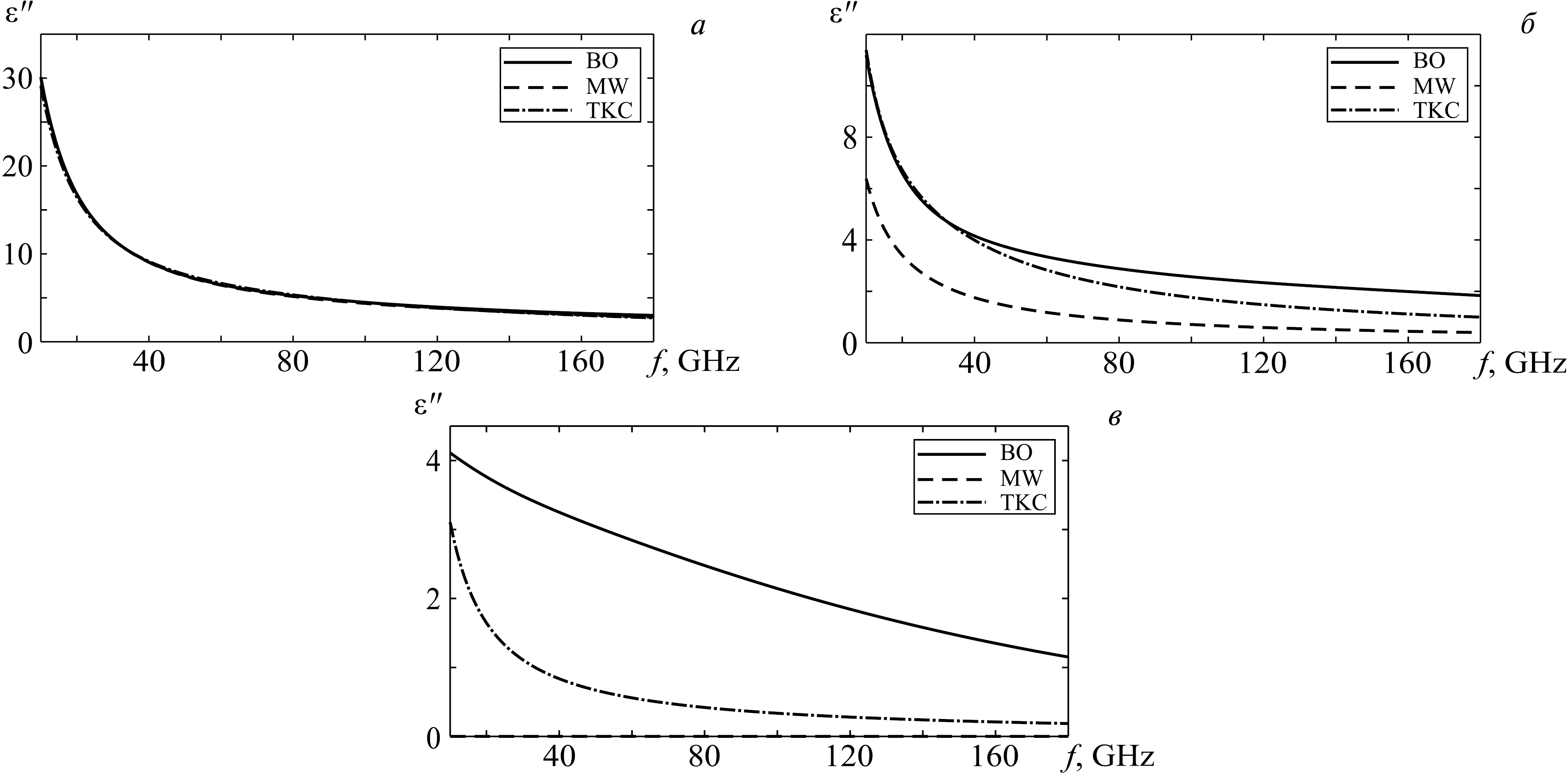 Поскольку в (Бордонский и др., 2017; Бордонский и др., 2019) связывается с механизмом потерь, определяемым взаимодействием с поверхностью порового пространства, то для исключения этого механизма для случая чисто объемной воды можно выполнить сравнение моделей только с использованием . На рис. 3 представлены результаты по нашей модели без учета и данные из других моделей для частот 60 ГГц; 90 ГГц и 140 ГГц.