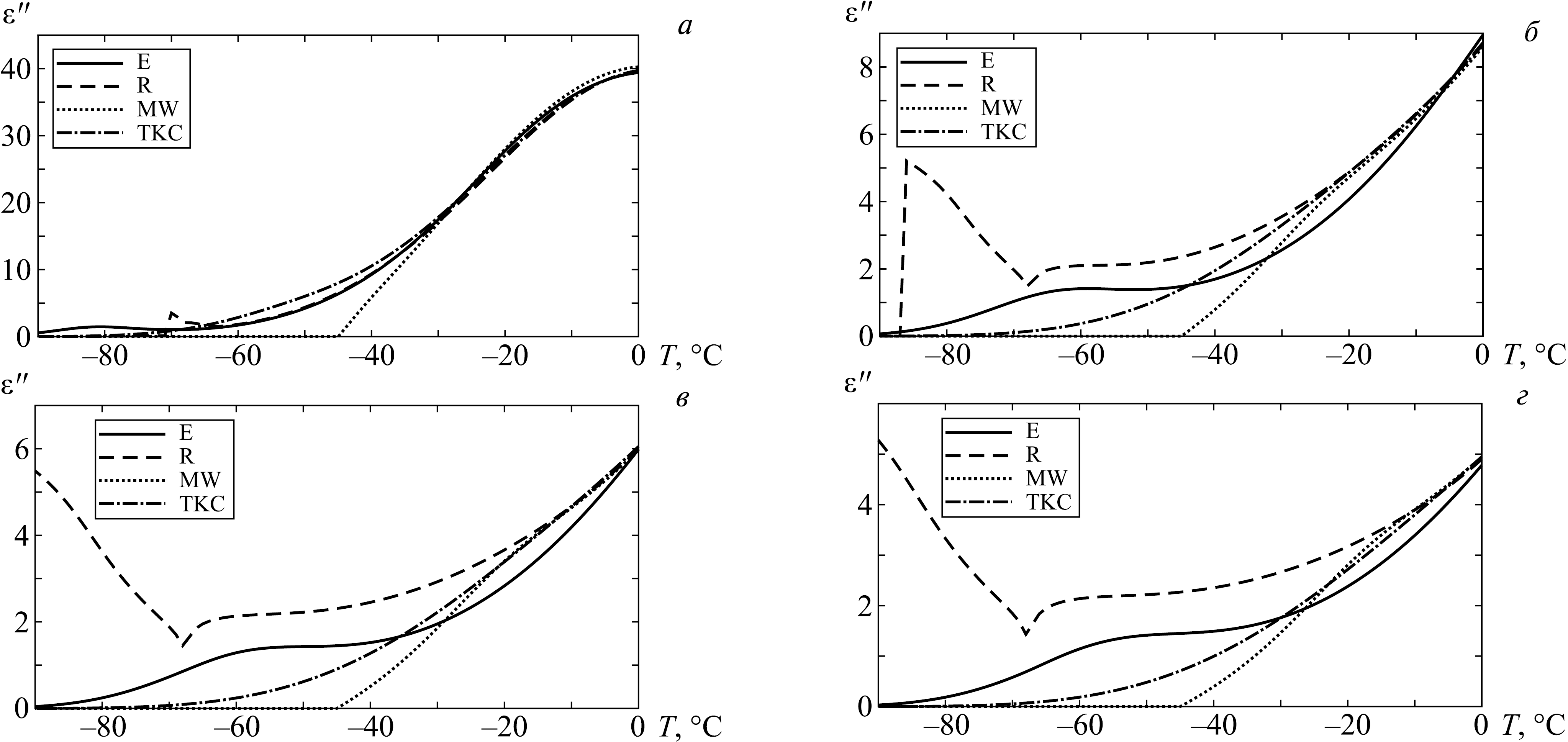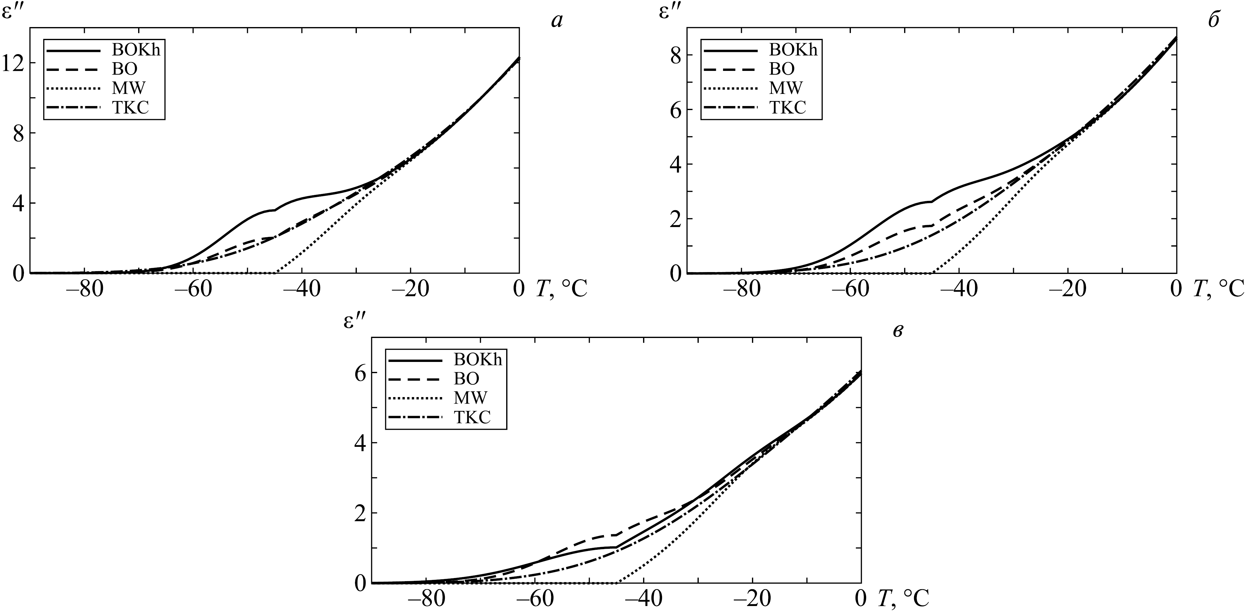 Модели, представленные в (Meissner, Wentz, 2004; Ellison, 2007; Rosenkranz, 2015; Turner et al., 2016), основаны на модели Дебая с одной или несколькими частотами релаксации ( ). В работе (Meissner, Wentz, 2004) было использовано гипотетическое представление для комплексной диэлектрической проницаемости , основанное на сингулярности при температуре 45 °C, для которого предполагали стремление частоты релаксации к нулевому значению, откуда следовало, что при этой температуре. В отличие от работы (Meissner, Wentz, 2004), в других моделях, где также теоретически пытались определить параметры глубоко переохлажденной воды, значения принимались в виде конечных и плавных ее изменений в зависимости от (Ellison, 2007; Rosenkranz, 2015; Turner et al., 2016). В нашей модели (Бордонский и др., 2017; Бордонский и др., 2019), основанной на экспериментальных данных, вводится дополнительное поглощение, определяемое недебаевским механизмом при температурах ниже − 30 °C. Используя формулы из этих работ, мы провели сравнение результатов по определению . В качестве примера выполнены расчеты по результатам работ (Meissner, Wentz, 2004; Turner et al., 2016) и по формулам (1), (2). Для формулы (2), основанной на эксперименте, использовали добавку как в виде суммы двух функций и , так и только в виде . , как отмечено выше, определяется влиянием второй критической точки воды, а замерзанием части воды при глубоком охлаждении увлажненной среды с образованием льда 0, который взаимодействует с материалом поровой матрицы.