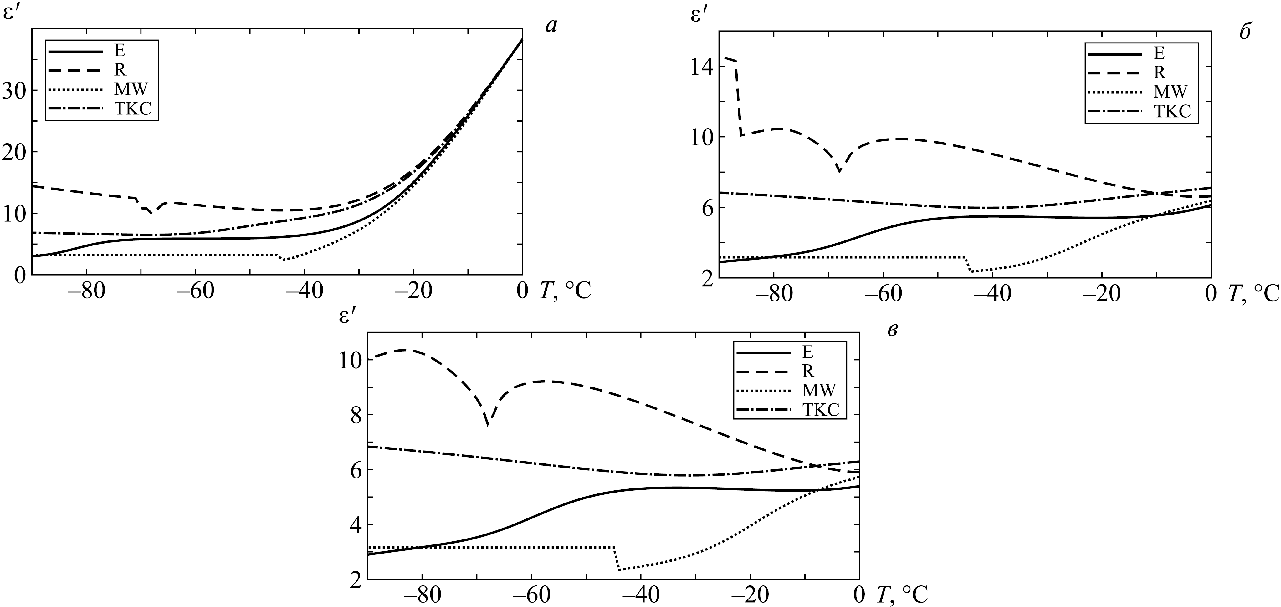При определении в (Бордонский и др., 2017; Бордонский и др., 2019) из измеренных значений коэффициента затухания по мощности ( ) использовали при вычислениях данные о действительной части относительной диэлектрической проницаемости ( ) из упрощенной модели работы (Meissner, Wentz, 2004). Можно было бы использовать формулы для ряда работ (Ellison, 2007; Rosenkranz, 2015; Turner et al., 2016), однако результаты этих исследований еще экспериментально не проверялись ниже 40 °C. Отсюда следует, что они не позволяют принципиально увеличить точность определения значений для по сравнению с использованием формулы для работы (Meissner, Wentz, 2004).