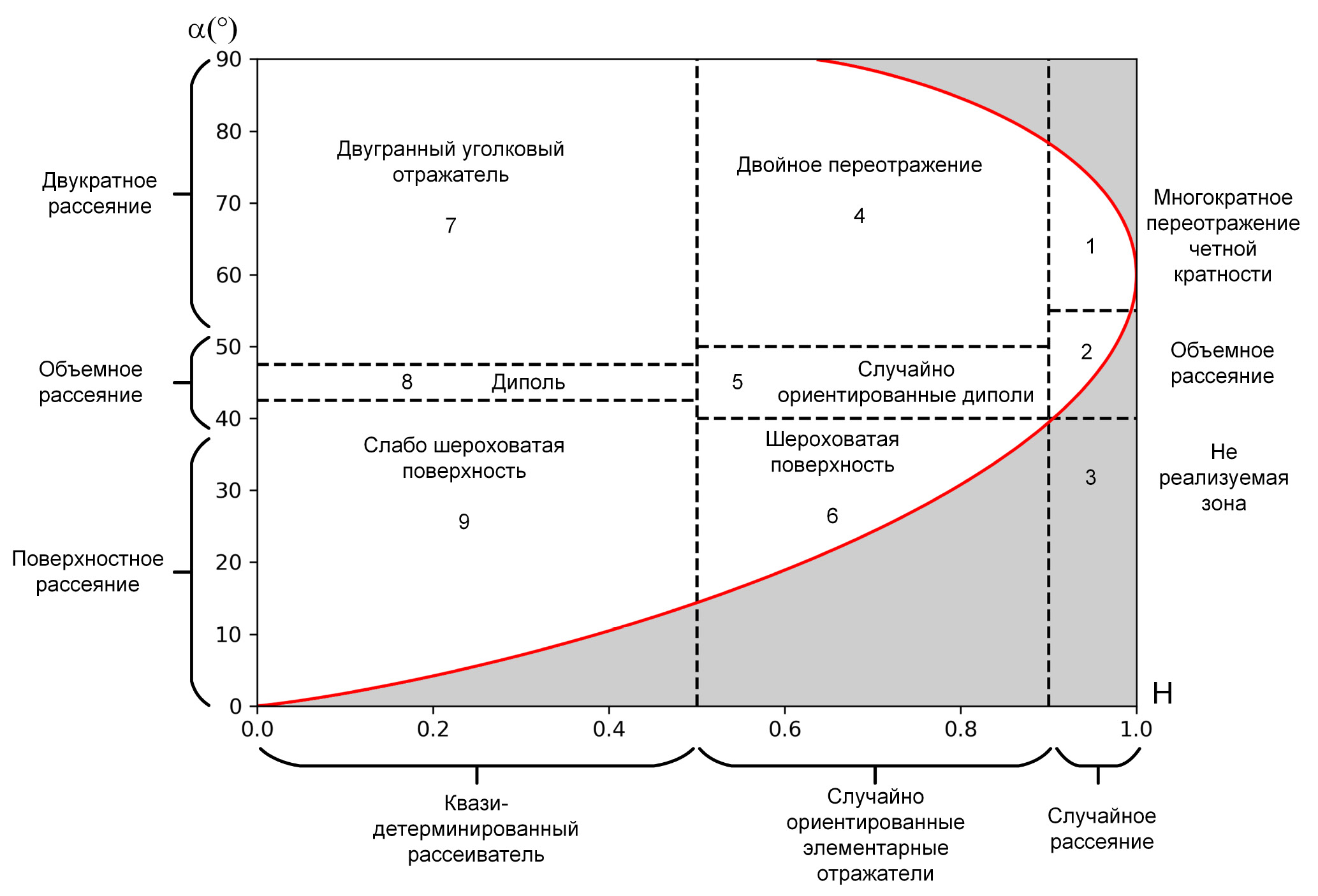 Угол α принимает значения от 0° (соответствует механизму поверхностного рассеяния) до 90° (соответствует двойному переотражению от идеально проводящей поверхности двугранного уголка). Промежуточное значение 45° отвечает дипольному рассеянию.