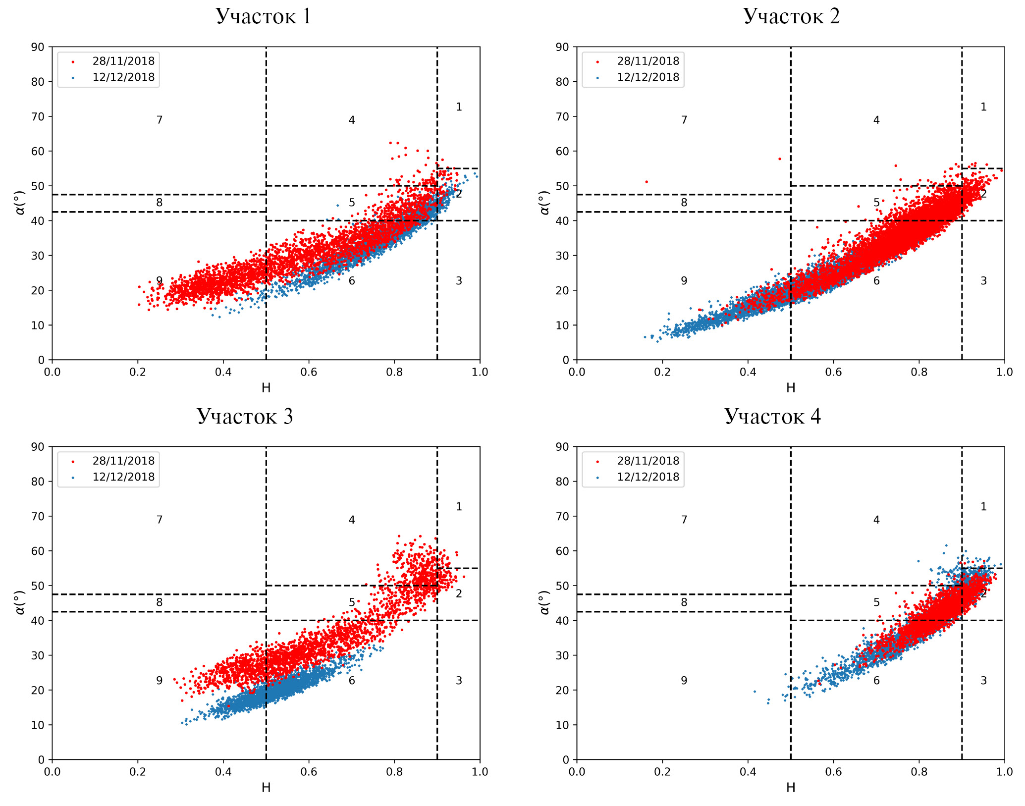 В соответствии с сегментацией плоскости H-α на девять зон (см. рис. 1) получаем, что до оползня параметры Н и α располагались в основном в зонах 6 и 9, характерных для поверхностного рассеяния, как и следовало ожидать для водной поверхности. Однако, часть точек находится в зонах 2, 4 и 5, характерных для многократного (объемного) рассеяния, присущего растительности. По-видимому, это можно объяснить сильным ветровым волнением водной поверхности в момент съемки, а также фрагментом противоположного оползню берега, попавшим в границы участка 1 благодаря тому, что он был засыпан сошедшим грунтом. После события участок 1 стал представлять собой поверхность оползня, сформированную грунтом и обломками каменной породы различного размера вперемешку с поваленными деревьями. Результаты декомпозиции показывают, что в этом случае брэгговское рассеяние практически исчезает, и большая часть эхосигнала приходит от крупномасштабных неровностей, которые также формируют многократное рассеяние, характерное для зон сегментации 2 и 5.