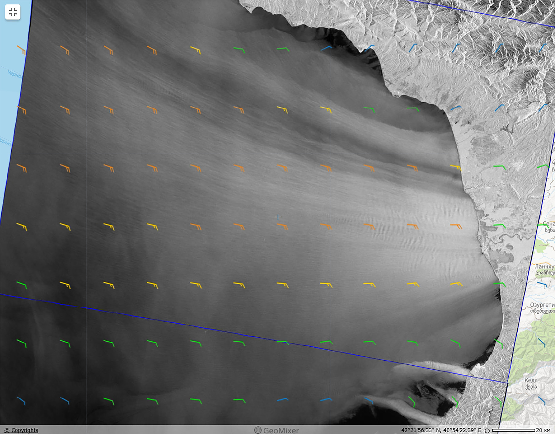 Рис. 1. Черноморский фён (из долины р. Риони, Грузия), отобразившийся на РЛИ спутника Sentinel-1A от 03.12.2017, 03:23 UTC (модельный ветер на 06:00 UTC; ветер над морем 8–10 м/с). © ESA