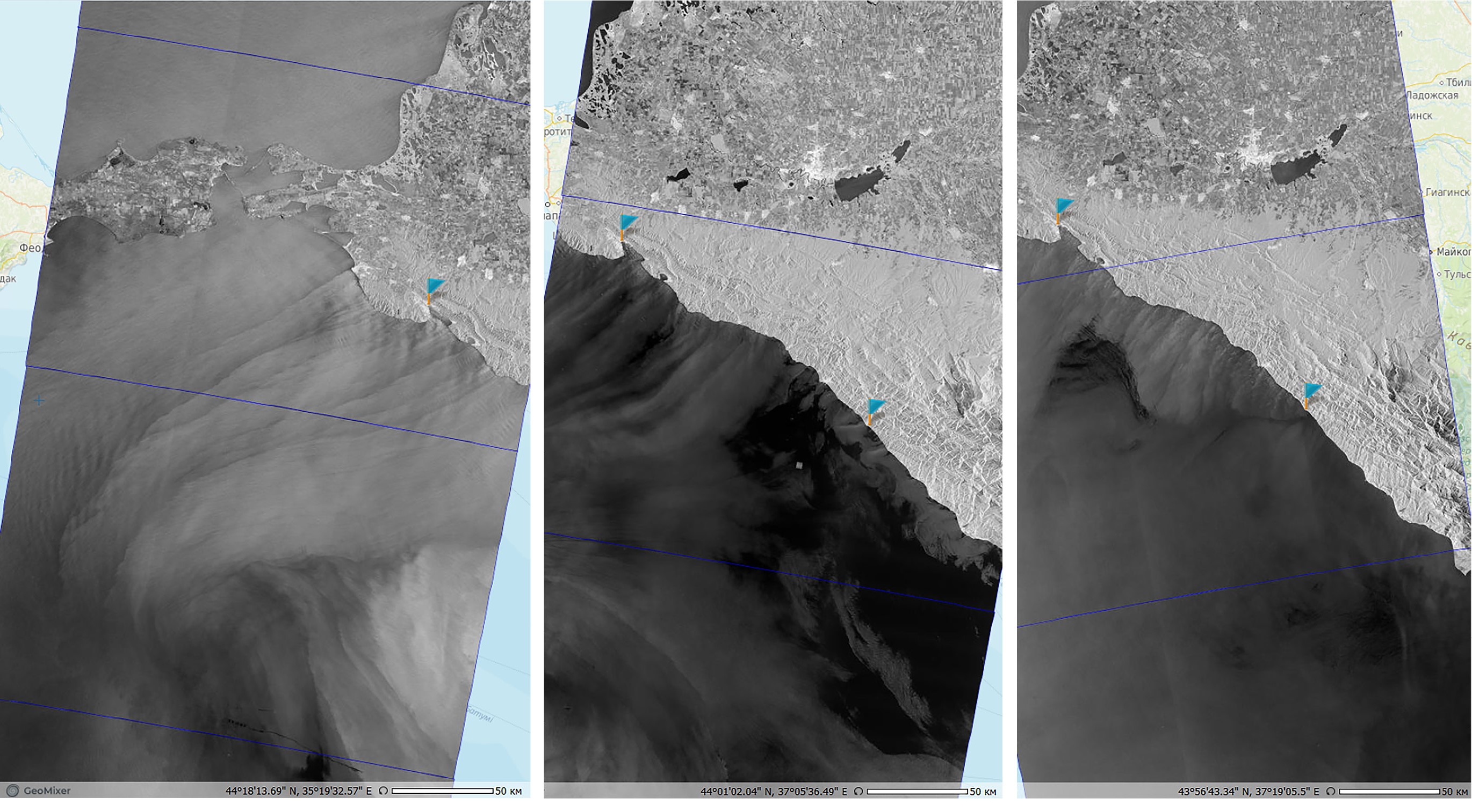 Рис. 2. Пример регистрации новороссийской боры на последовательных РЛИ спутников Sentinel-1B и Sentinel-1A от 30.05, 31.05 и 01.06.2018 (флажками отмечены г. Новороссийск и пос. Лазаревское, южнее которого бора фактически не развивается). © ESA