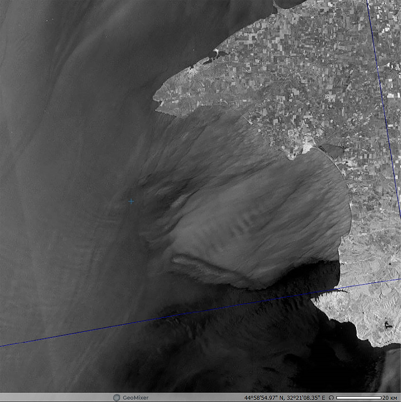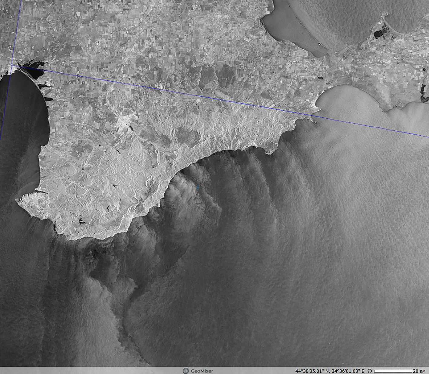 Рис. 4а. Крымская бора, отобразившаяся на РЛИ спутника Sentinel-1A 26.09.2018, 03:49 UTC. © ESA
