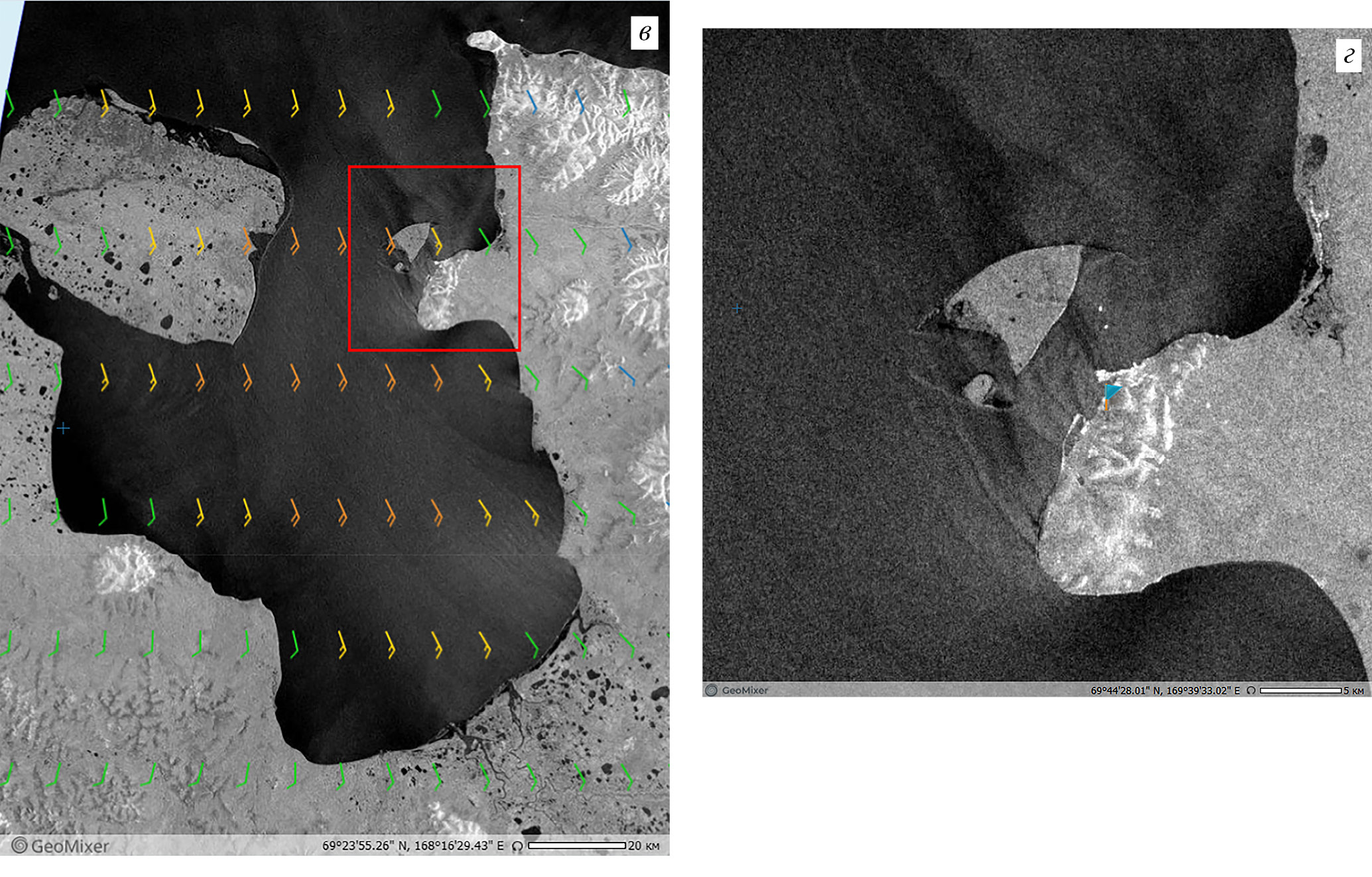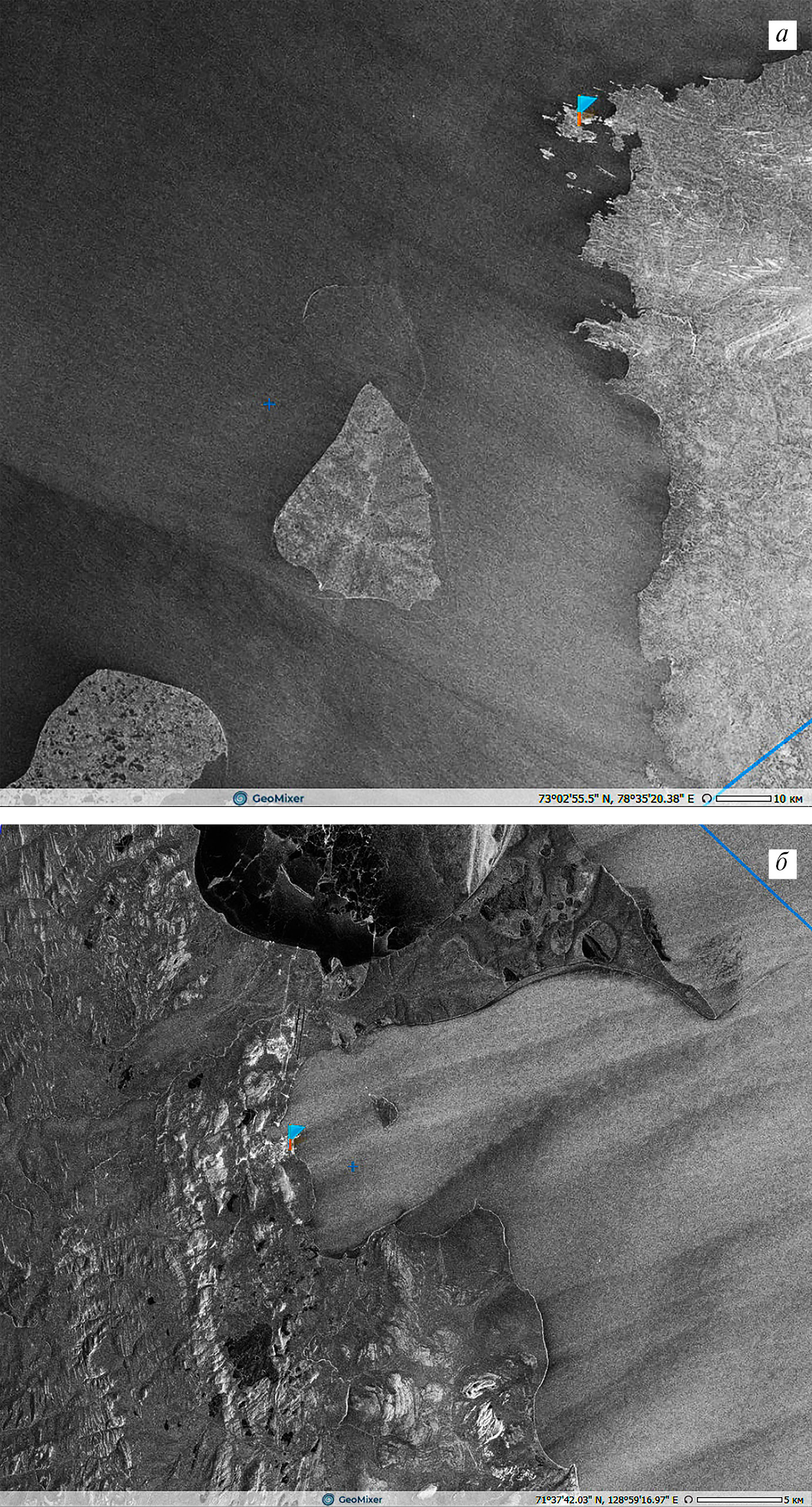 Рис. 6а, б. а — южак (юго-восточный местный ветер) в районе о. Диксон (пос. Диксон — флажок) и на прилегающей акватории Енисейского залива, отобразившийся на РЛИ Sentinel-1B от 12.10.2018 (01:28 UTC); б — южак (юго-западный местный ветер) в бухте Тикси и губе Буор-Хая (флажок — пос. Тикси), отобразившийся на РЛИ Sentinel-1B от 19.10.2018 (21:55 UTC). © ESA