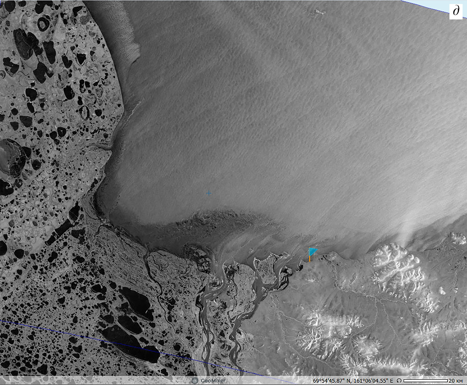 Рис. 6д. Южак (юго-западный местный ветер) над акваторией, примыкающей к устью р. Колыма, отобразившийся на РЛИ Sentinel-1B от 16.10.2018 (19:51 UTC) (флажок — с. Абмарчик). © ESA