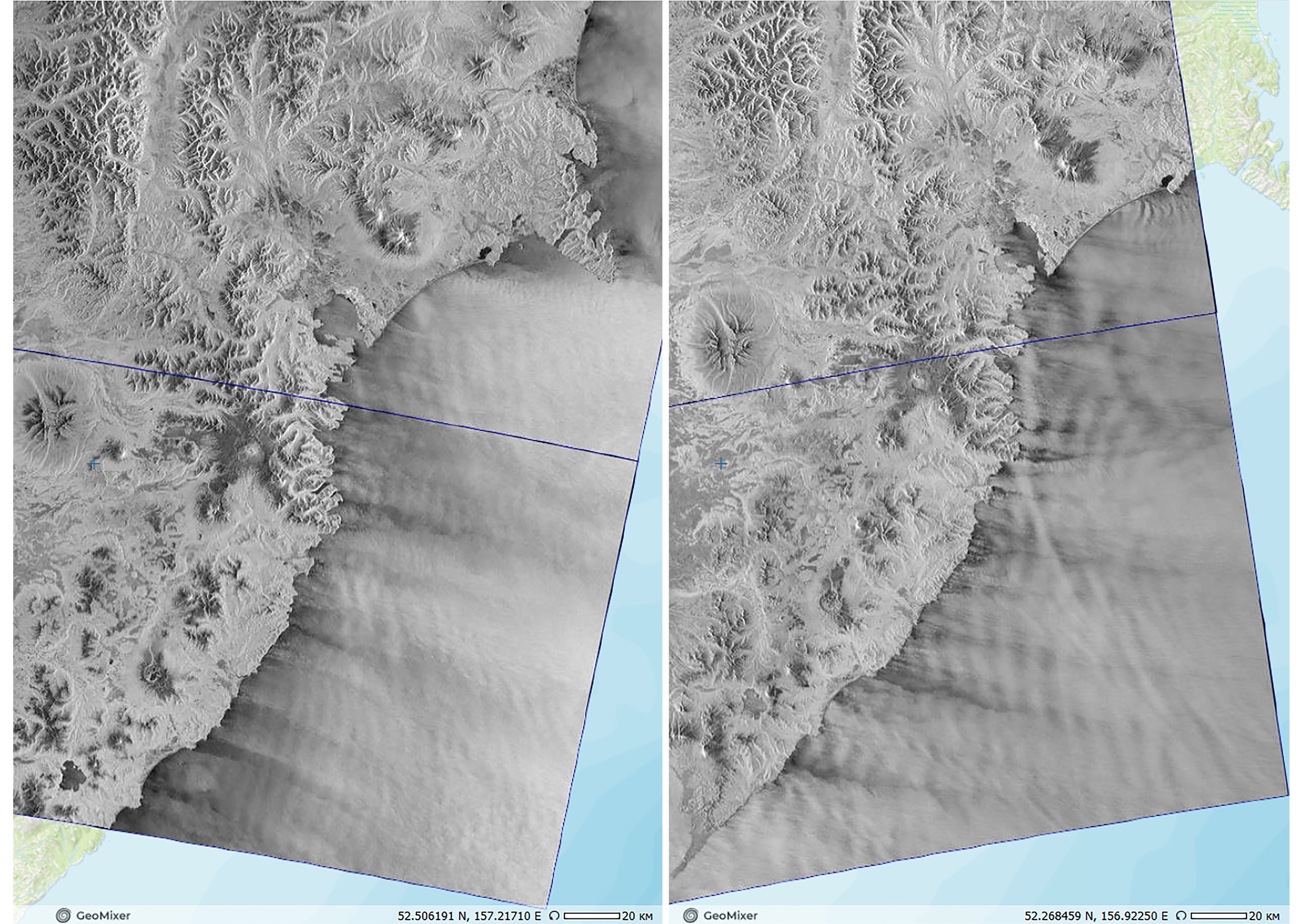 Рис. 8. Бороподобный (западный) ветер у восточного побережья Камчатки, отобразившийся на РЛИ спутников Sentinel-1A от: 10.11.2017 (19:41 UTC) и 14.11.2017 (07:15 UTC). © ESA